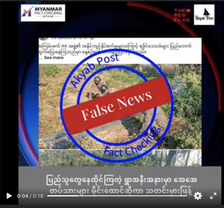 MFCN/ The Akyab Post/ The Red Flag Fact-check 28 Jan 2025 အခုရက်ပိုင်း စစ်ကောင်စီဝါဒဖြန့်ချန်နယ်တွေမှာ အာရက္ခတပ်တော် အေအေက ပြည်သူတွေ နေထိုင်ကြတဲ့ ရွာအနီးအနားပတ်ဝန်းကျင်မှာ မိုင်းထောင်နေတယ်ဆိုပြီးတော့ ရေးသားထားကြတဲ့ ပို့စ်တွေဟာ ပုံနဲ့တကွ ပျံ့နှံ့လျက်ရှိပါတယ်။ တယ်လီဂရန်မှာ စစ်ကောင်စီဝါဒဖြန့်ချန်နယ်တစ်ခုဖြစ်တဲ့ “တိုက်ပွဲသတင်းစုံ”