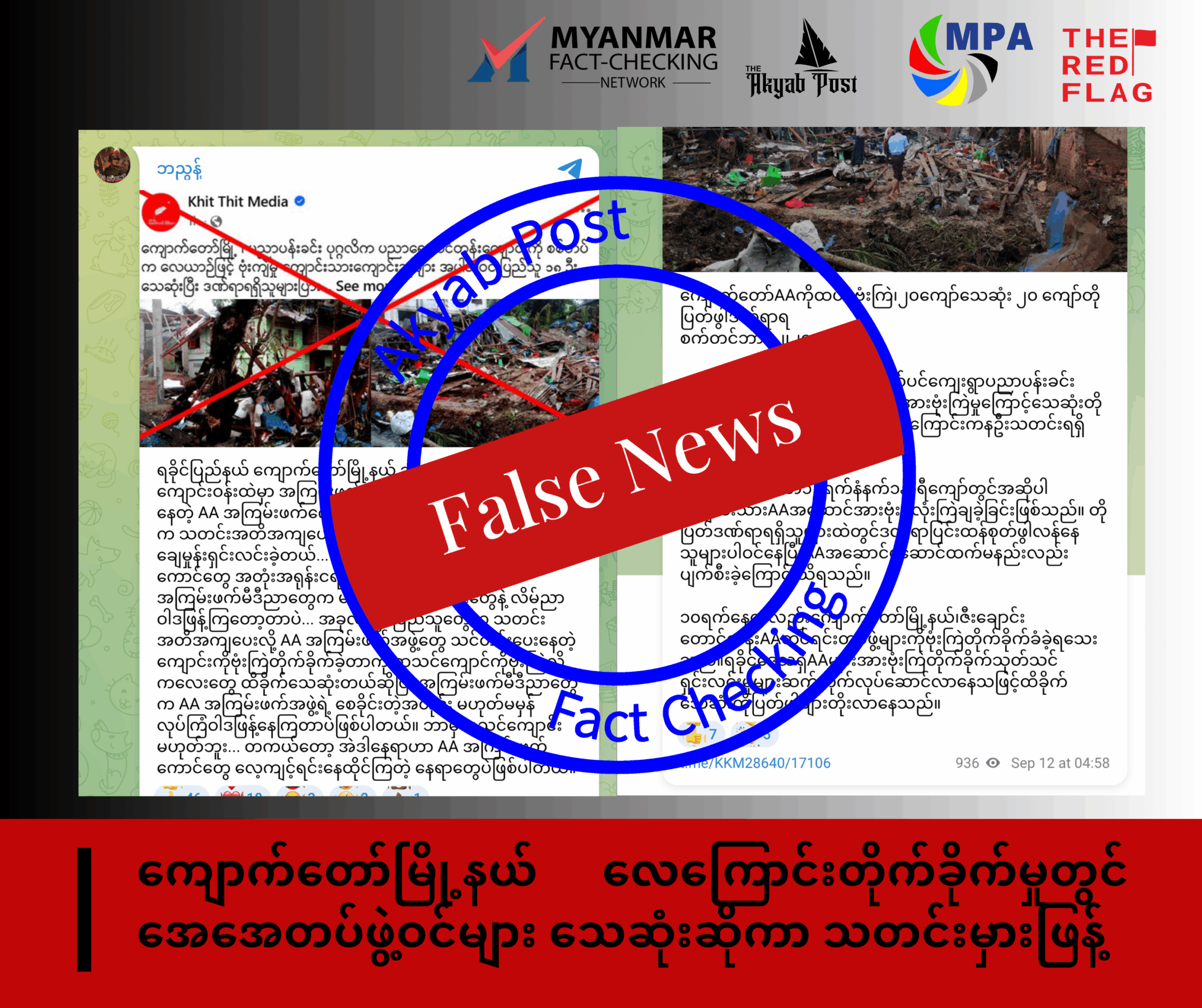 ဒီပို့စ်ကို Myanmar Fact-checking Network အဖွဲ့ဝင်ဖြစ်တဲ့ Akyab Post ကနေ စစ်ဆေးကြည့်လိုက်တဲ့အခါမှာ ကျောက်တော်မြို့နယ် သရက်တပင်ကျေးရွာကို စစ်ကောင်စီဖက်ကနေ လေကြောင်းတိုက်ခိုက်မှုအတွင်း သေဆုံးသူတွေဟာ အေအေစစ်သားတွေမဟုတ်ဘဲ အသက်မပြည့်သေးတဲ့ ကလေးသူငယ်တွေပါဝင်နေပြီးတော့၊ ဗုံးကြဲခံရတဲ့နေရာဟာ စစ်ကောင်စီဝါဒဖြန့် ချန်နယ်တွေမှာ ဖြန့်ထားသလိုမျိုး အေအေစစ်သင်တန်းကျောင်းမဟုတ်ဘဲ ကိုယ်ပိုင်အထက်တန်းကျောင်း တစ်ကျောင်းသာ ဖြစ်နေတာကို စစ်ဆေးအတည်ပြုနိုင်ခဲ့ပါတယ်။