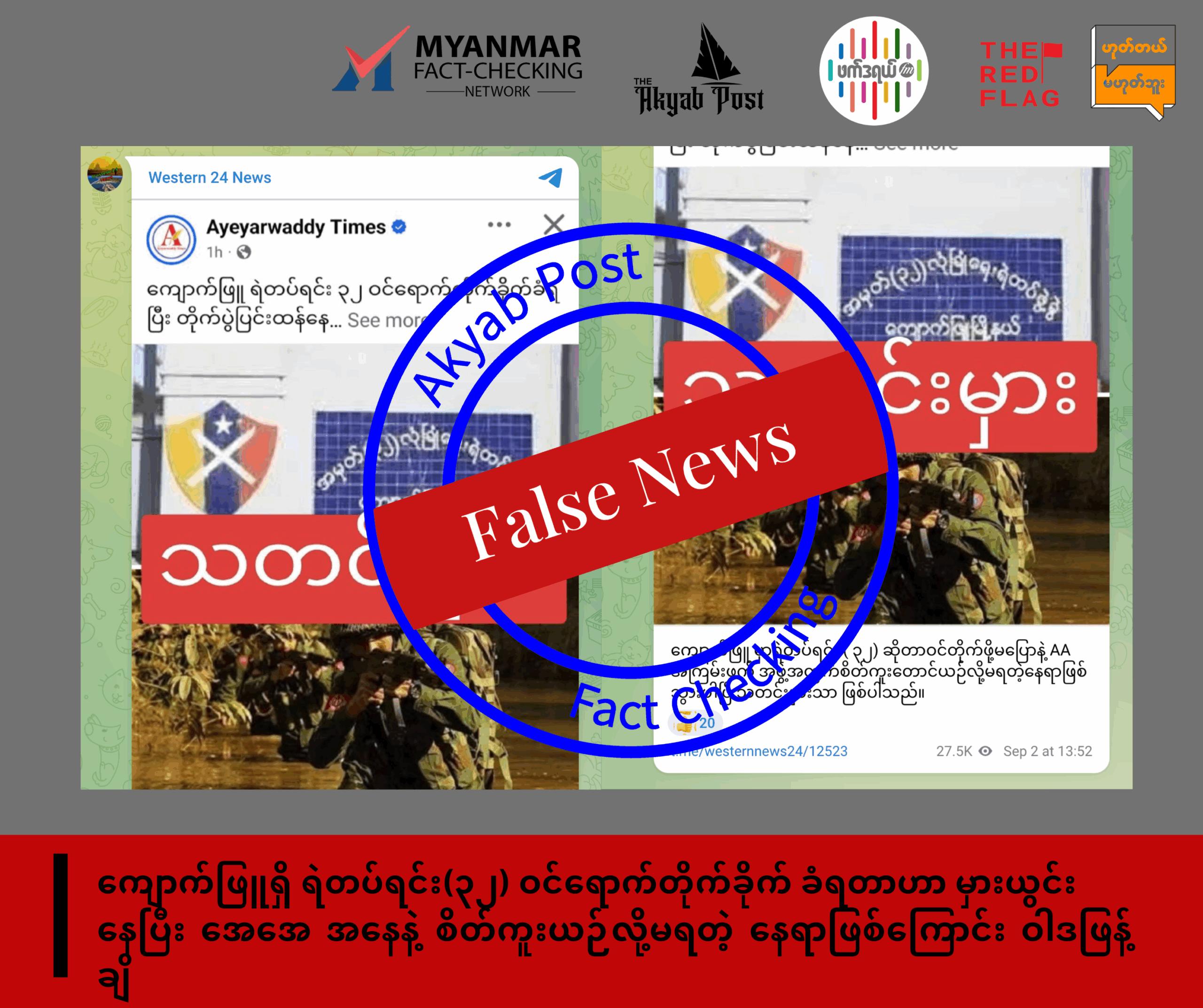 ရခိုင်ပြည်၊ ကျောက်ဖြူရှိ စစ်ကော်မရှင်လက်အောက်ခံ ရဲတပ်ရင်း(၃၂) ဝင်ရောက်တိုက်ခိုက် ခံရတဲ့ အကြောင်းအရာဟာ မှားယွင်းနေပြီး AAအနေနဲ့ စိတ်ကူးပင်ယဉ်လို့မရတဲ့ နေရာဖြစ်ကြောင်း စစ်ကောင်စီဝါဒဖြန့် ချန်နယ်တစ်ခုဖြစ်တဲ့ western 24 news တယ်လီဂရမ် ချန်နယ်က ဒီနေ့ စက်တင်ဘာ ၂ ရက်နေ့မှာ ဧရာဝတီသတင်းဌာနက ရေးသားထားတဲ့ သတင်းကို screenshot ယူပြီး ဖြန့်ချိခဲ့တာကြောင့် ပျံ့နှံ့မှုတွေ များနေပါတယ်။