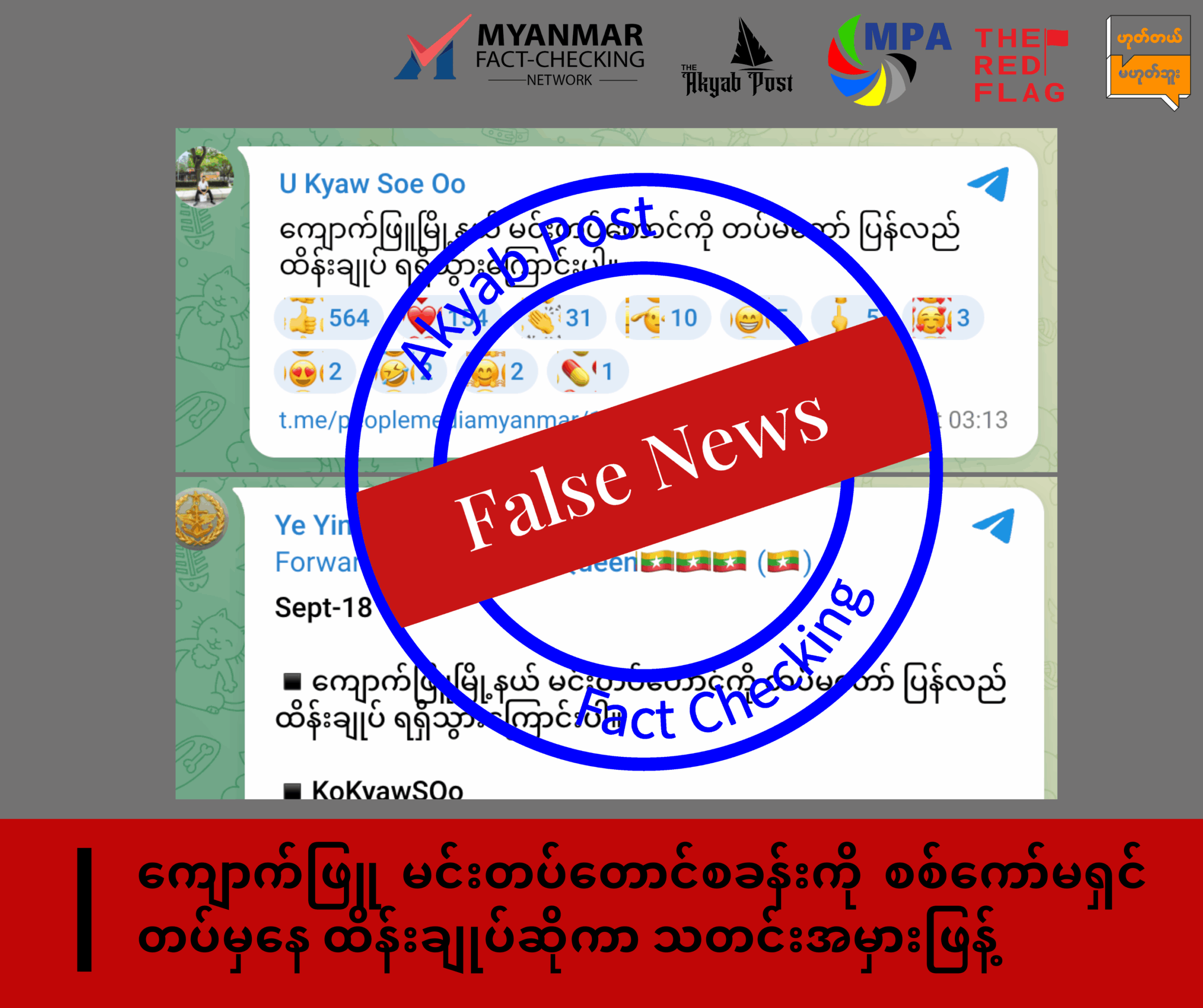 စစ်တပ်လော်ဘီများ ဖြန့်ဝေထားသော အကြောင်းအရာကို Myanmar Fact-checking Network၏ အဖွဲ့ဝင် မီဒီယာဖြစ်သော MPA နှင့် Akyab Post ကို ပူးပေါင်း၍ အချက်အလက်စစ်ဆေးရာ သတင်းအမှားဖြစ်ကြောင်း စစ်ဆေးတွေ့ရှိရသည်။
