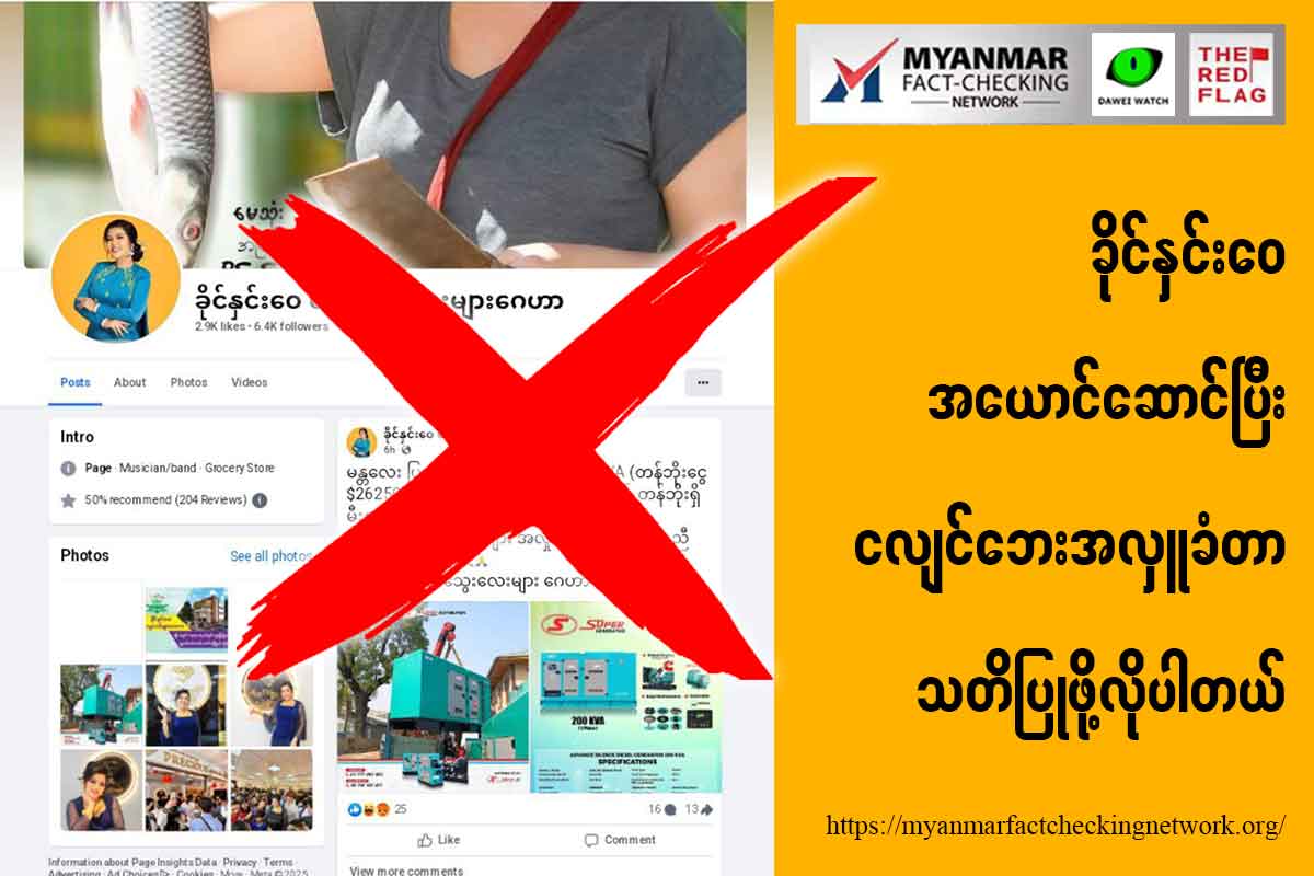 အဲဒီစာမျက်နှာ ကို Myanmar Factchecking Network အဖွဲ့ဝင်ဖြစ်တဲ့ Dawei Watch က အချက်အလက်စိစစ်တဲ့အခါ သရုပ်ဆောင် ခိုင်နှင်းဝေ အမည်နဲ့ ငလျင်ဘေးကို အသုံးချ ငွေလိမ်ဖို့ လုပ်ဆောင်နေတာ အဖြစ် စိစစ်တွေ့ရပါတယ်။