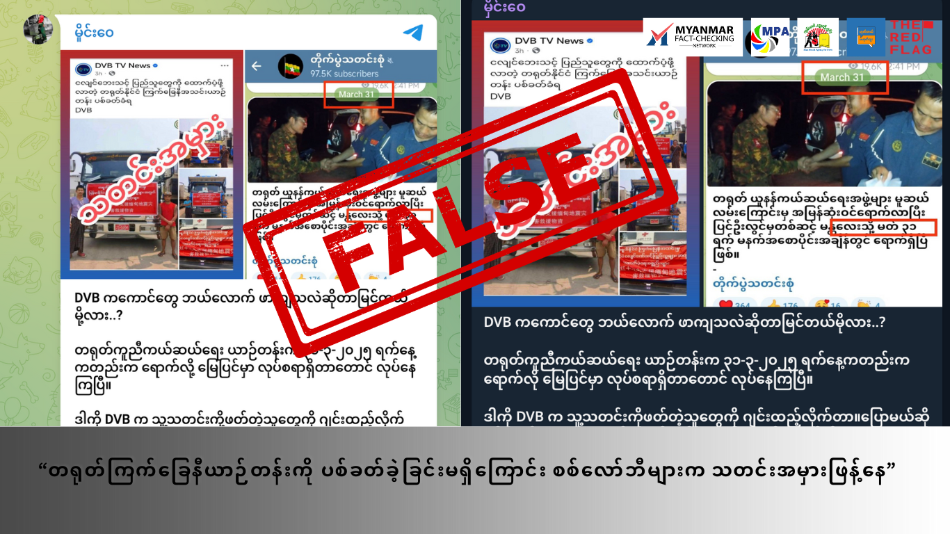 စစ်ကောင်စီအာပေး တယ်လီဂရမ် ဝါဒဖြန့်ချန်နယ်တစ်ခုဖြစ်သည့် မှိုင်းဝေချန်နယ်က ဖြန့်ချိခဲ့ပြီး DVB သတင်းဌာနမှ ရေးသားဖော်ပြထားခဲ့သော “ငလျင်ဘေးသင့် ပြည်သူတွေကို ထောက်ပံ့ဖို့လာတဲ့ တရုတ်နိုင်ငံ ကြက်ခြေနီ အသင်းယာဉ်တန်း ပစ်ခတ်ခံရ” ဆိုသည့် အကြောင်းအရာကို မဟုတ်မမှန်သတင်းအမှားဟု ရေးသားဖြန့်ချိခဲ့သည်။
