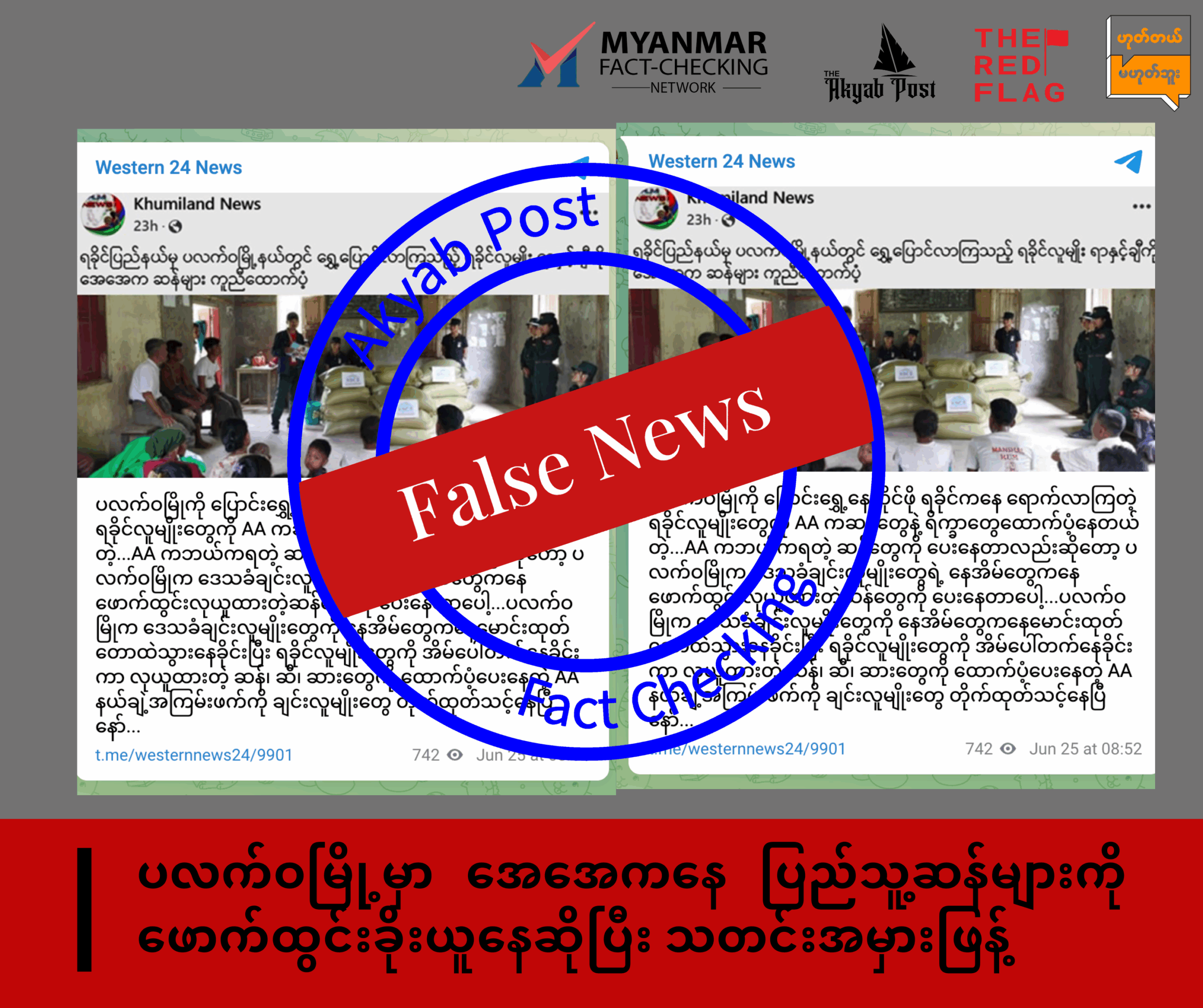 တယ်လီဂရမ်မှာ ရခိုင်ဒေသနဲ့ ပတ်သက်ပြီးတော့ သတင်းတုသတင်းမှားတွေနဲ့ အမုန်းစကားတွေကို ဖြန့်လေ့ရှိတဲ့ စစ်ကောင်စီဝါဒဖြန့်ချန်နယ် Western 24 News ကနေ ဇွန်လ ၂၅ ရက်နေ့မှာ “ ပလက်ဝမြိုကို ပြောင်းရွှေ့နေထိုင်ဖို ရခိုင်ကနေ ရောက်လာကြတဲ့ ရခိုင်လူမျိုးတွေကို AA ကဆန်တွေနဲ့ ရိက္ခာတွေထောက်ပံ့နေတယ်တဲ့…AA ကဘယ်ကရတဲ့ ဆန်တွေကို ပေးနေတာလည်းဆိုတော့ ပလက်ဝမြိုက ဒေသခံချင်းလူမျိုးတွေရဲ့ နေအိမ်တွေကနေ ဖောက်ထွင်းလုယူထားတဲ့ဆန်တွေကို ပေးနေတာပေါ့…ပလက်ဝမြိုက ဒေသခံချင်းလူမျိုးတွေကို နေအိမ်တွေကနေမောင်းထုတ် တောထဲသွားနေခိုင်းပြီး ရခိုင်လူမျိုးတွေကို အိမ်ပေါ်တက်နေခိုင်းကာ လုယူထားတဲ့ ဆန်၊ ဆီ၊ ဆားတွေကို ထောက်ပံ့ပေးနေတဲ့ AA နယ်ချဲ့အကြမ်းဖက်ကို ချင်းလူမျိုးတွေ တိုက်ထုတ်သင့်နေပြီနော်…” (မူရင်းအရေးအသား) ဆိုပြီးတော့ ရေးသားထားပါတယ်။