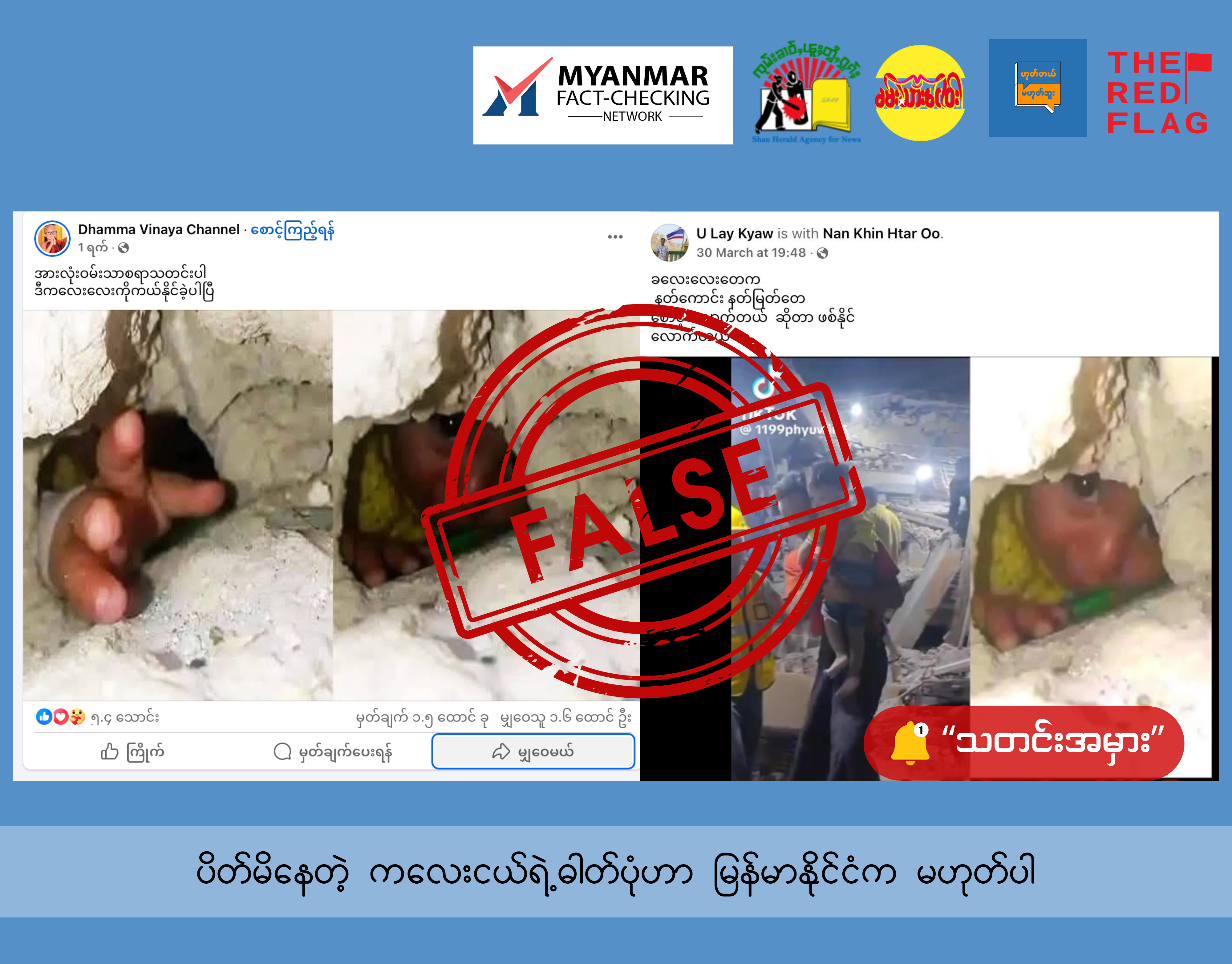 အဆောက်အဦ အပျက်အစီးတွေကြားမှာ ပိတ်မိနေတဲ့ ကလေးငယ်တစ်ယောက်ပုံကို အသုံးပြုပြီး မြန်မာနိုင်ငံက ငလျင်ကပ်ဘေးဖြစ်စဉ်မှာ ဖြစ်နေတယ်ဆိုပြီး ဖြန့်ဝေချက်တစ်ခု ပြန့်နှံ့နေပါတယ်။