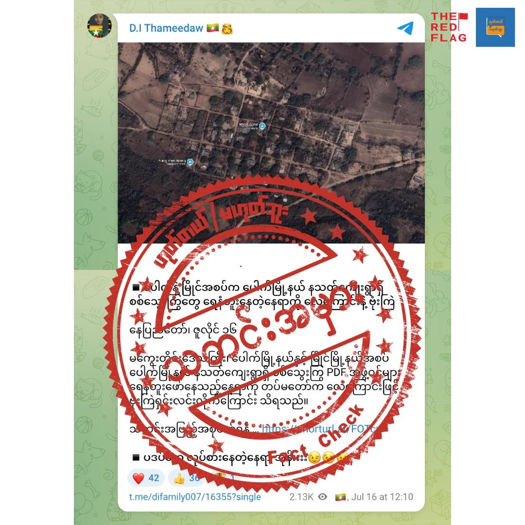 စစ်ကောင်စီဝါဒဖြန့် ချယ်နယ်မှာပျံ့နှံ့လျက်ရှိတဲ့ ပိုစ့်ကို ဒေသတွင်းသတင်းဋ္ဌာနတွေရဲ့ ရေးသားဖော်ပြချက်တွေ၊ပြည်တွင်းသတင်းဋ္ဌာနတွေရဲ့ ရေးသားဖော်ပြချက်တွေနဲ့ တိုက်စစ်ကြည့်တဲ့အခါ စစ်ကောင်စီဝါဒဖြန့် ချယ်နယ်မှာပျံ့နှံ့နေသလိုမျိူး PDFအဖွဲ့ဝင်တွေ ရေနံတူးဖော်နေတဲ့ နေရာကို တပ်မတော်က လေကြောင်းနဲ့ ဗုံးကြဲရှင်းလင်းခဲ့တယ် ဆိုတာကို မတွေ့ရှိရပါဘူး။ အထက်ပါသတင်းဖော်ပြချက်တွေနဲ့တိုက်ဆိုင်စစ်ဆေးကြည့်သည့်အခါ စစ်ကောင်စီဝါဒဖြန့် ချန်နယ်တခုဖြစ်သည့် D.I. Thameedaw မှ တင်ထားသည့်အကြောင်းအရာသည် သတင်းအမှားဖြစ်ကြောင်းတွေ့ရပါတယ်။