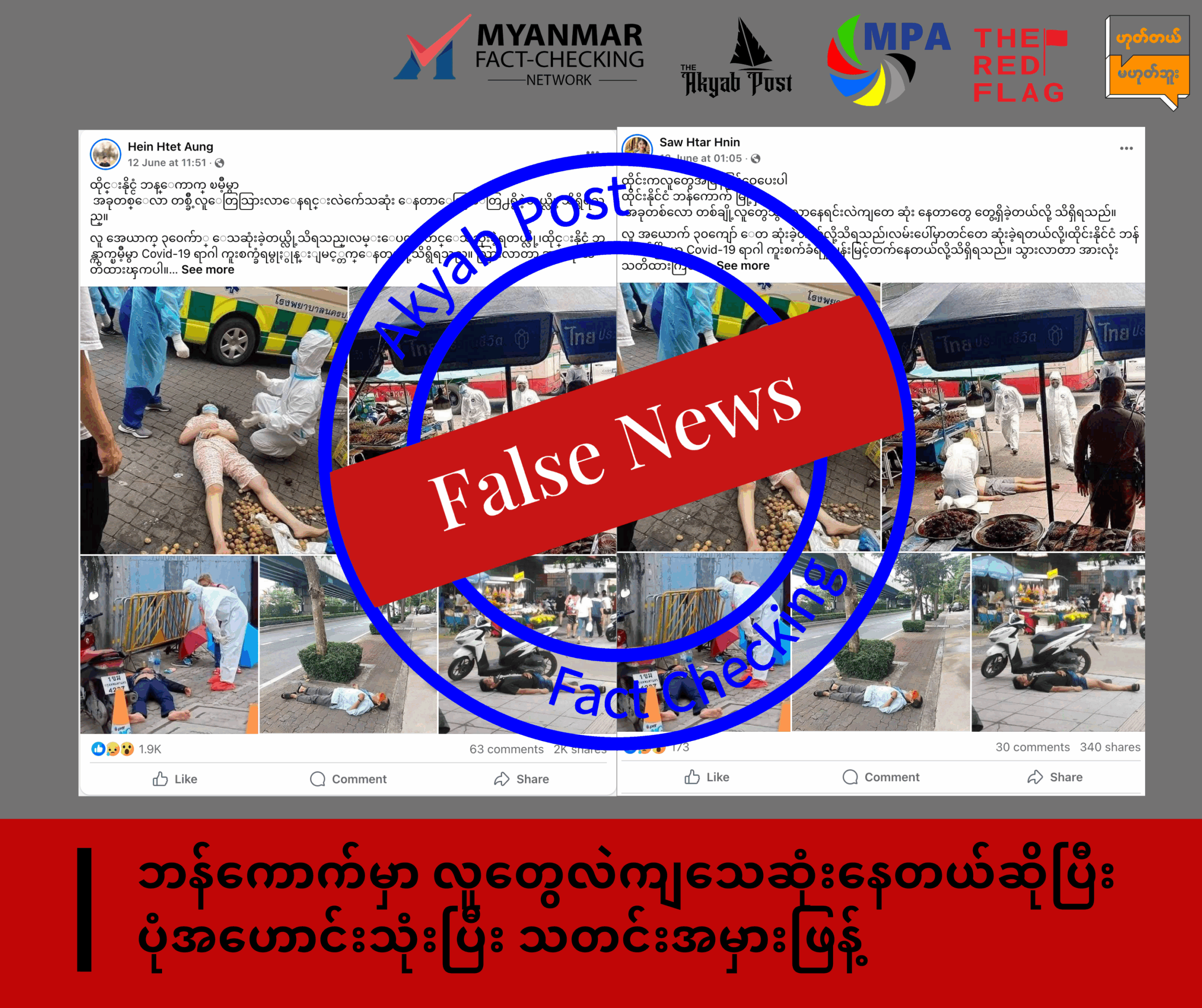 ဖေ့ဘွတ်ခ် လူမှုကွန်ရက်စာမျက်နှာတွင် ကိုဗစ်ကြောင့် ဘန်ကောက်မှာ လူတွေ လဲကျပို့စ်တွေကို Myanmar Fact Checking Network အဖွဲ့ဝင်ဖြစ်တဲ့ Akyab Post နဲ့ Myanmar Pressphoto Agency တို့ဖက်ကနေ စစ်ဆေးခဲ့ကြည့်လိုက်တဲ့အခါမှာ ၂၀၂၅ ဇွန်လအတွင်းမှာ ကိုဗစ်ကြောင့် လူတွေလဲကျသေဆုံးတာမဟုတ်ပဲ လွန်ခဲ့တဲ့ ၂၀၂၁ ခုနှစ်မှာ ဖြစ်ခဲ့တဲ့ ပုံအဟောင်းတွေကို သုံးပြီးတော့ သတင်းမှားဖြန့်ခဲ့တာကို တွေ့ရပါတယ်။