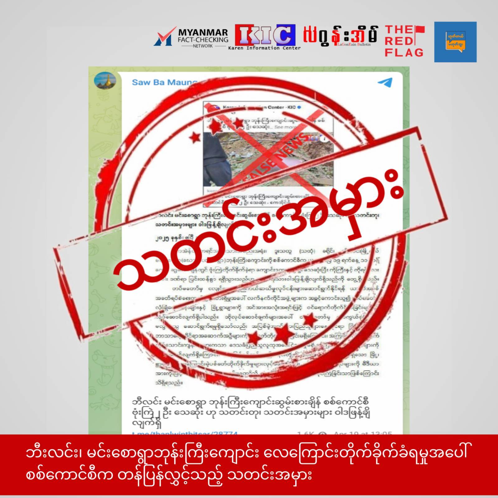 အဆိုပါရေးသားဖော်ပြချက်ကို Myanmar Fact-Checking Network အဖွဲ့ဝင် Lagon Eain, KIC, The Red Flag တို့မှစိစစ်ချက်အရ သတင်းအမှားဖြစ်သည်။