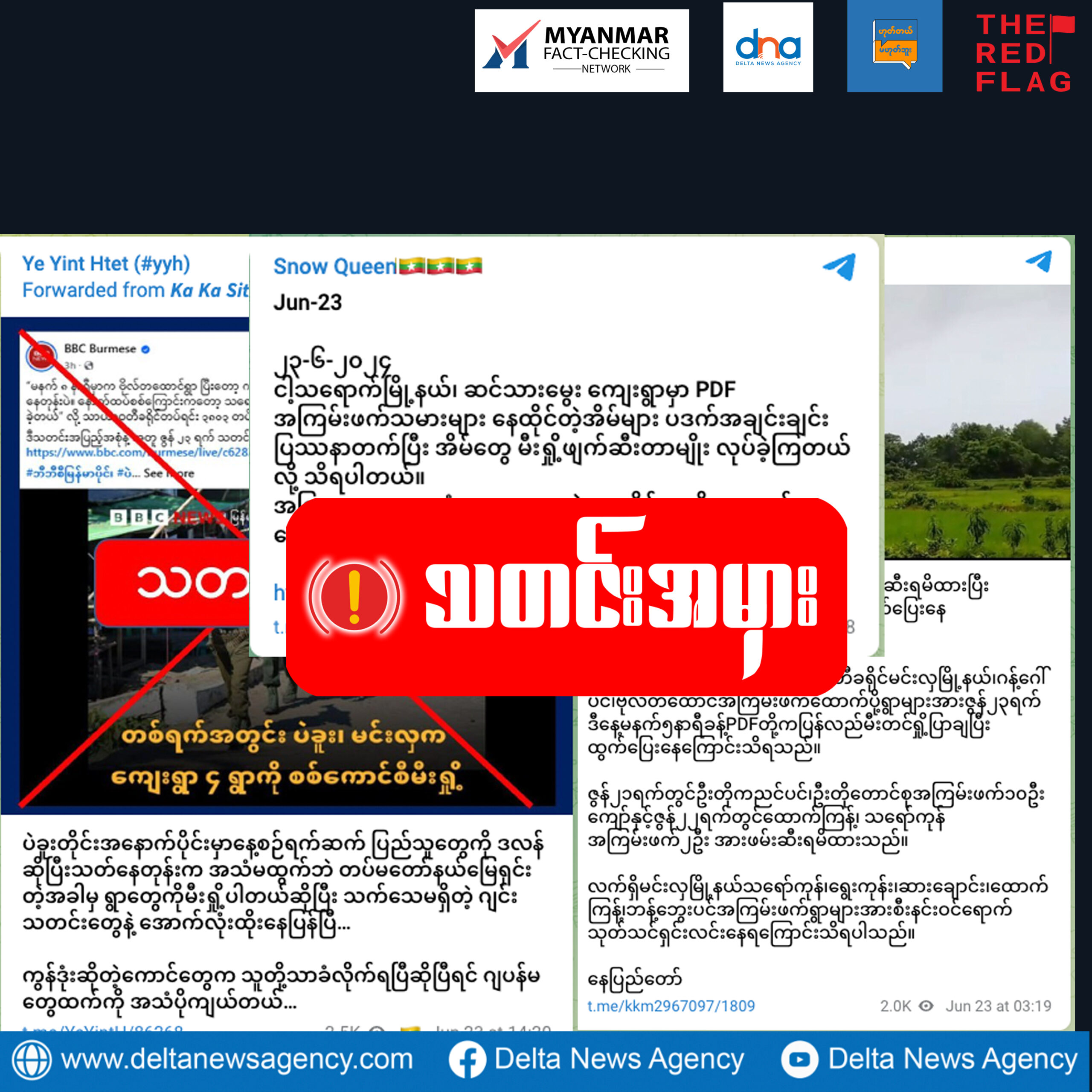 ဒီအကြောင်းအရာနဲ့ပတ်သက်ပြီး MFCN အဖွဲ့ဝင်ဖြစ်တဲ့ DNA Fact Checkကနေစစ်ဆေးကြည့်တဲ့အခါမှာ ပြည်သူ့ကာကွယ်ရေးတပ်တွေက ကျေးရွာတွေကို မီးရှို့ခဲ့တယ်ဆိုတဲ့အကြောင်းအရာမှာ မှားယွင်းနေပြီး သတင်းမှားဖြစ်ကြောင်းတွေ့ရှိခဲ့ပါတယ်။