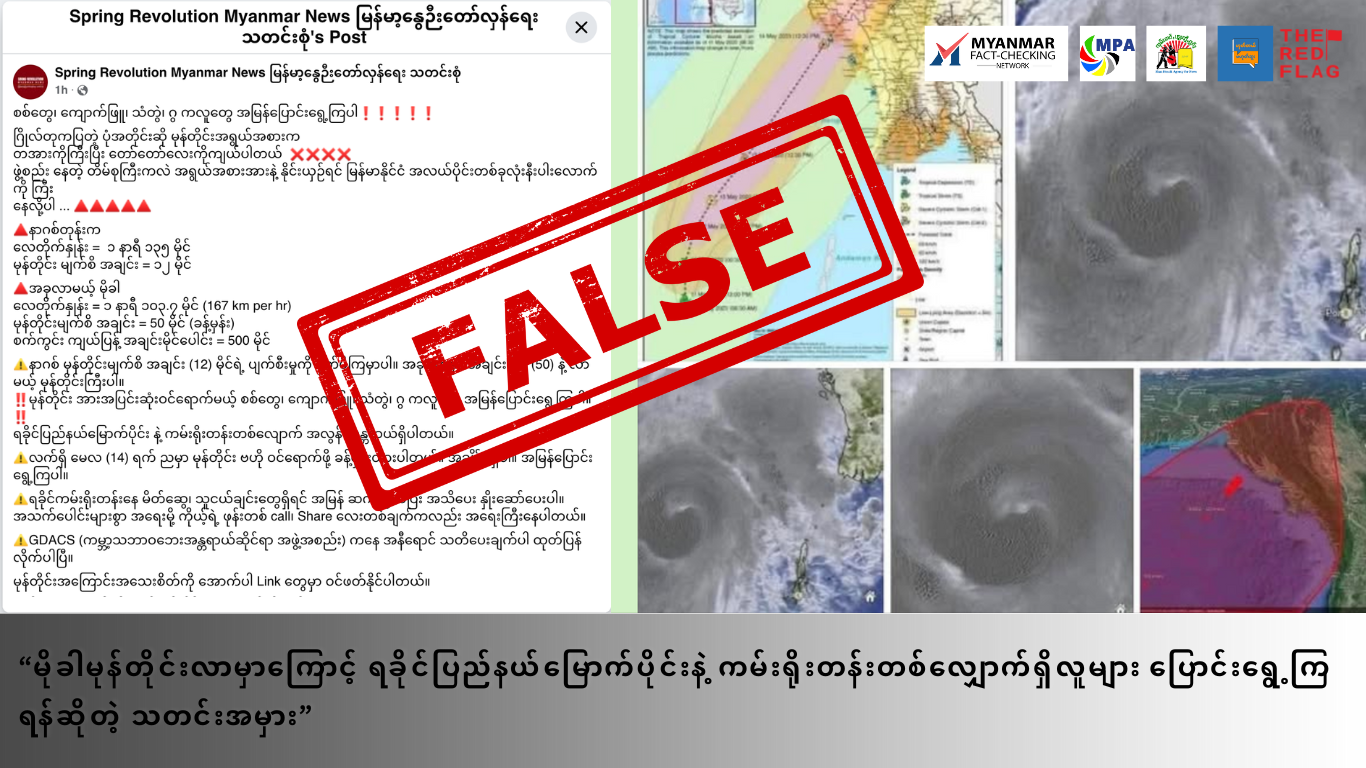 ရခိုင်ပြည်နယ်မြောက်ပိုင်းနှင့် ကမ်းရိုးတန်းတစ်လျောက်ရှိ နေထိုင်သူများအနေဖြင့် မိုခါမုန်တိုင်းလာမှာကြောင့် အမြန်ပြောင်းရွေ့ကြရန်လိုအပ်ဆိုသည့် သတင်းအမှားအကြောင်းအရာတစ်ခု ဆိုရှယ်မီဒီယာတွင် ဧပြီ ၂ ရက်က ပျံ့နှံ့ခဲ့သည်။