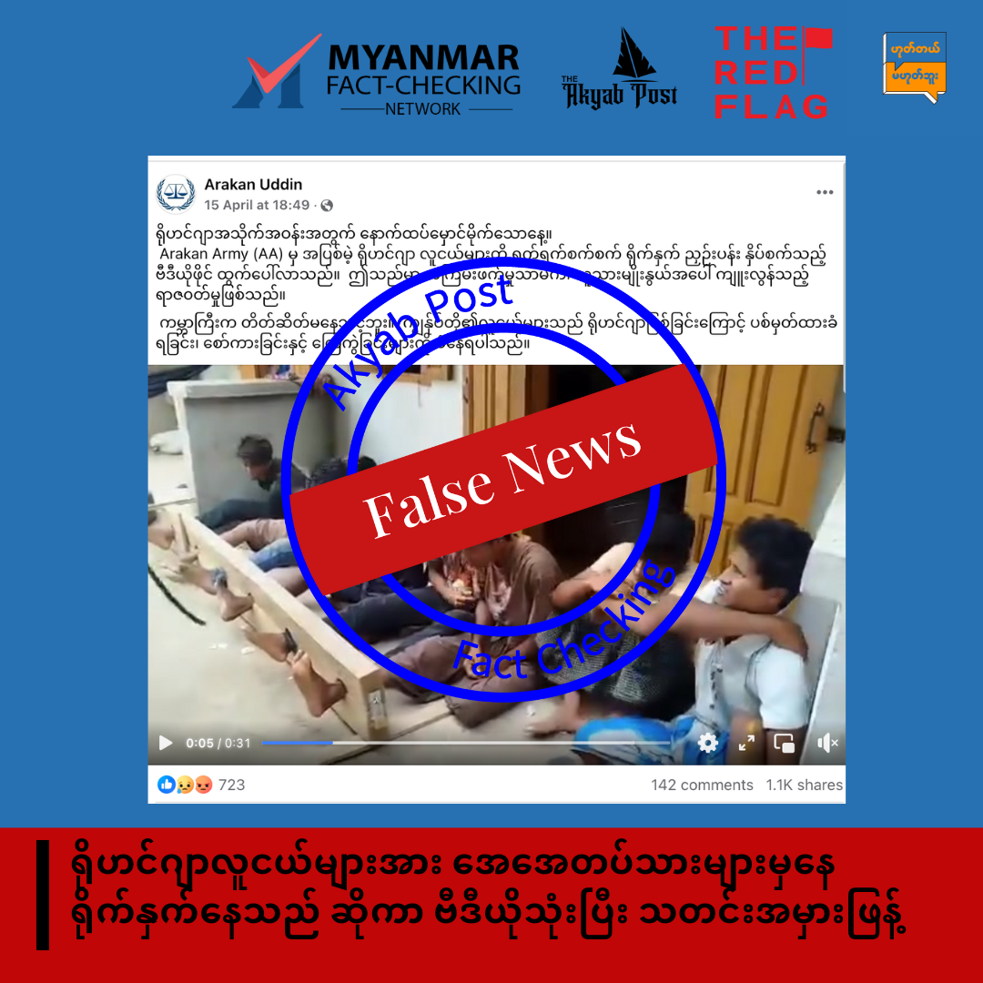 ရိုဟင်ဂျာလူငယ်တွေကို ထိပ်တုံးခတ်ထားပြီးတော့ လူတစ်ဦးက ရိုက်နှက်နေတဲ့ ဗီဒီယိုတစ်ခု ဧပြီလ ၁၅ ရက်နေ့က စလို့ ဆိုရှယ်မီဒီယာထက်မှာ ပျံ့နှံ့လျက်ရှိပါတယ်။ ဆိုရှယ်မီဒီယာပေါ်က သတင်းအမှားဖြန့်တဲ့ အကောင့်တွေနဲ့ စစ်ကောင်စီဝါဒဖြန့် ချန်နယ်တွေကနေ အေအေတပ်သားတွေက ရိုဟင်ဂျာတွေအပေါ် ရိုက်နှက်နေပါတယ်ဆိုပြီးတော့ ဒီဗီဒီယိုကို အသုံးပြုပြီးတော့ သတင်းအမှား ဖြန့်နေကြပါတယ်။