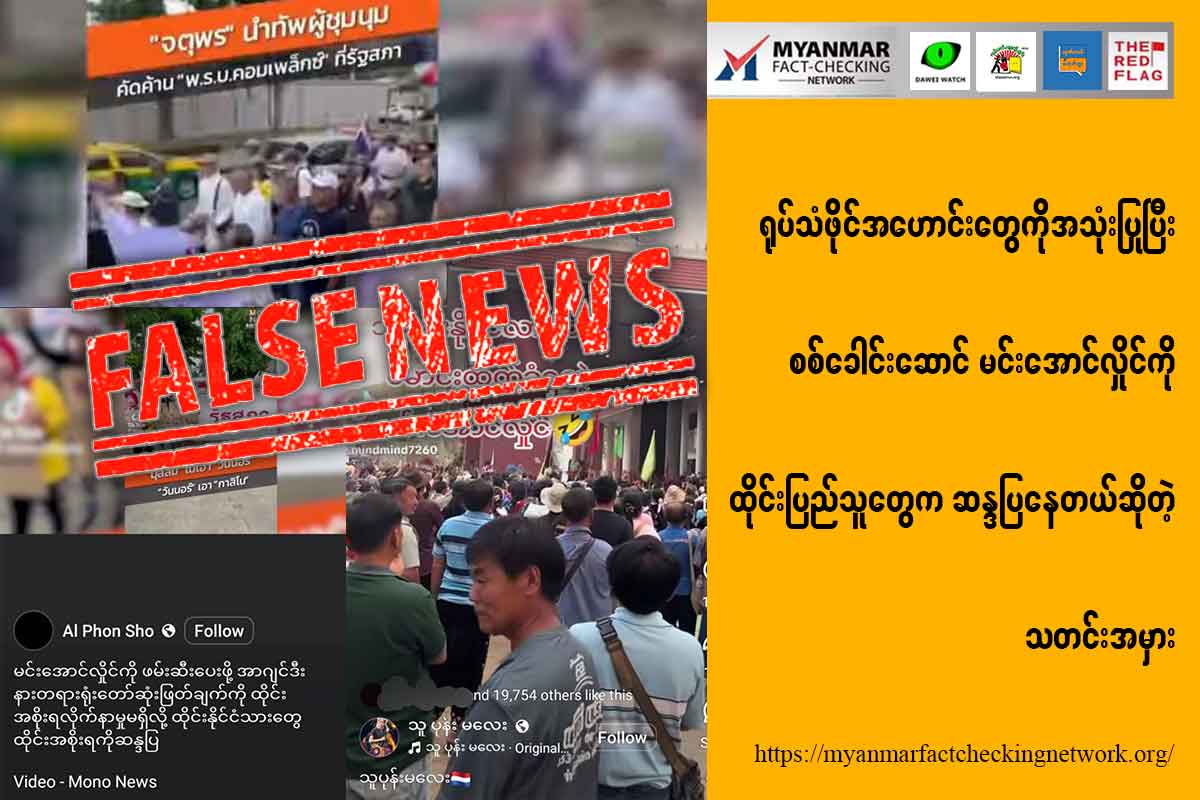 အခုလို မြန်မာနိုင်ငံမှာ မြေငလျင်ဘေးဒဏ်သင့်နေချိန် ထိုင်းနိုင်ငံကိုရောက်ရှိနေတဲ့ ဗိုလ်ချုပ်မှူးကြီး မင်းအောင်လှိုင်ကို ထိုင်းပြည်သူတွေက ဆန့်ကျင်ဆန္ဒပြကြဖို့ လှုံ့ဆော်နေတဲ့အချိန်မှာ မသက်ဆိုင်တဲ့ အကြောင်းအရာ၊ ရုပ်သံဟောင်းတွေကို အသုံးပြုပြီး ပြန်လည်မျှဝေနေတာကို စိစစ်တွေ့ရှိရပါတယ် ။