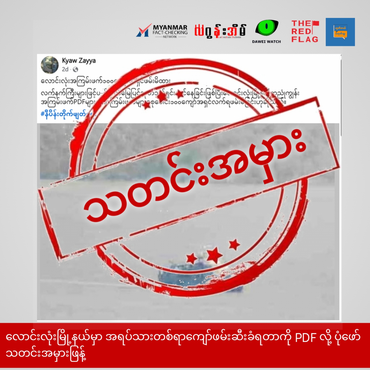 လောင်းလုံးမှာ PDF တစ်ရာကျော် အရှင်ဖမ်းမိထားတယ်ဆိုပြီး “Kyaw Zayya” အမည်နဲ့ Facebook အကောင့်က ဖြန့်ချိတာ တွေ့ရပါတယ်။ အောက်ဖော်ပြပါလင့်ခ်မှာ ကြည့်နိုင်ပါတယ်။