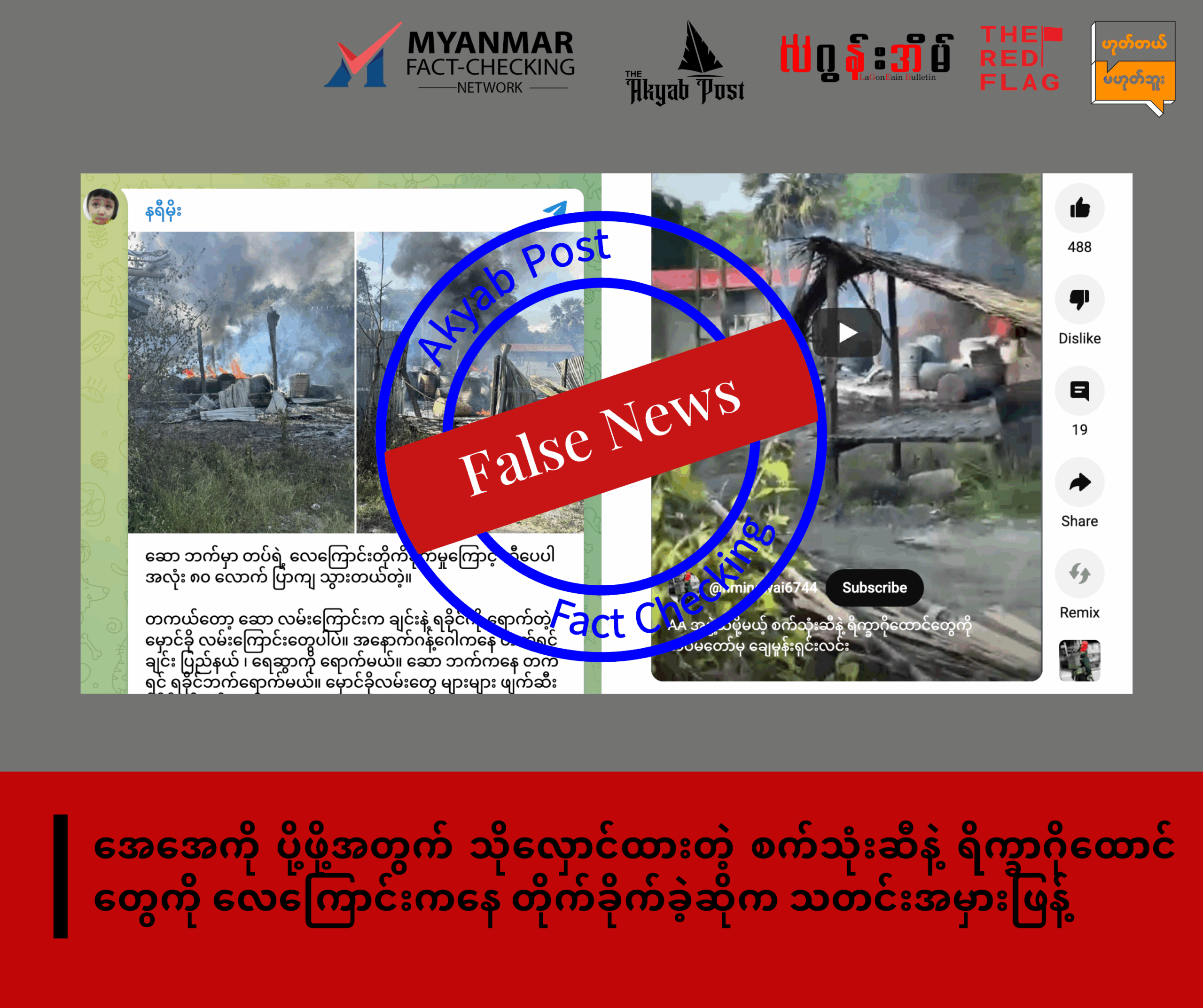 ဖေ့ဘွတ်ခ် လူမှုကွန်ရက်စာမျက်နှာတွေနဲ့ စစ်ကောင်စီဝါဒဖြန့်ချန်နယ်တွေမှာ ပျံံ့နှံ့လို့ရှိတဲ့ အကြောင်းအရာတွေကို Myanmar Fact Checking Network အဖွဲ့ဝင်ဖြစ်တဲ့ Akyab Post နဲ့ “လဂွန်းအိမ်” တို့ဖက်ကနေ စစ်ဆေးခဲ့ကြည့်လိုက်တဲ့အခါမှာ ဆောနဲ့ ဆိပ်ဖြူမှာ လေကြောင်းတိုက်ခိုက်ခဲ့လို့ မီးလောင်ပျက်စီးခဲ့မှုတွေဟာ ပြည်သူပိုင်ပစ္စည်းတွေ ဖြစ်နေတာကိုသာ တွေ့ရပါတယ်။