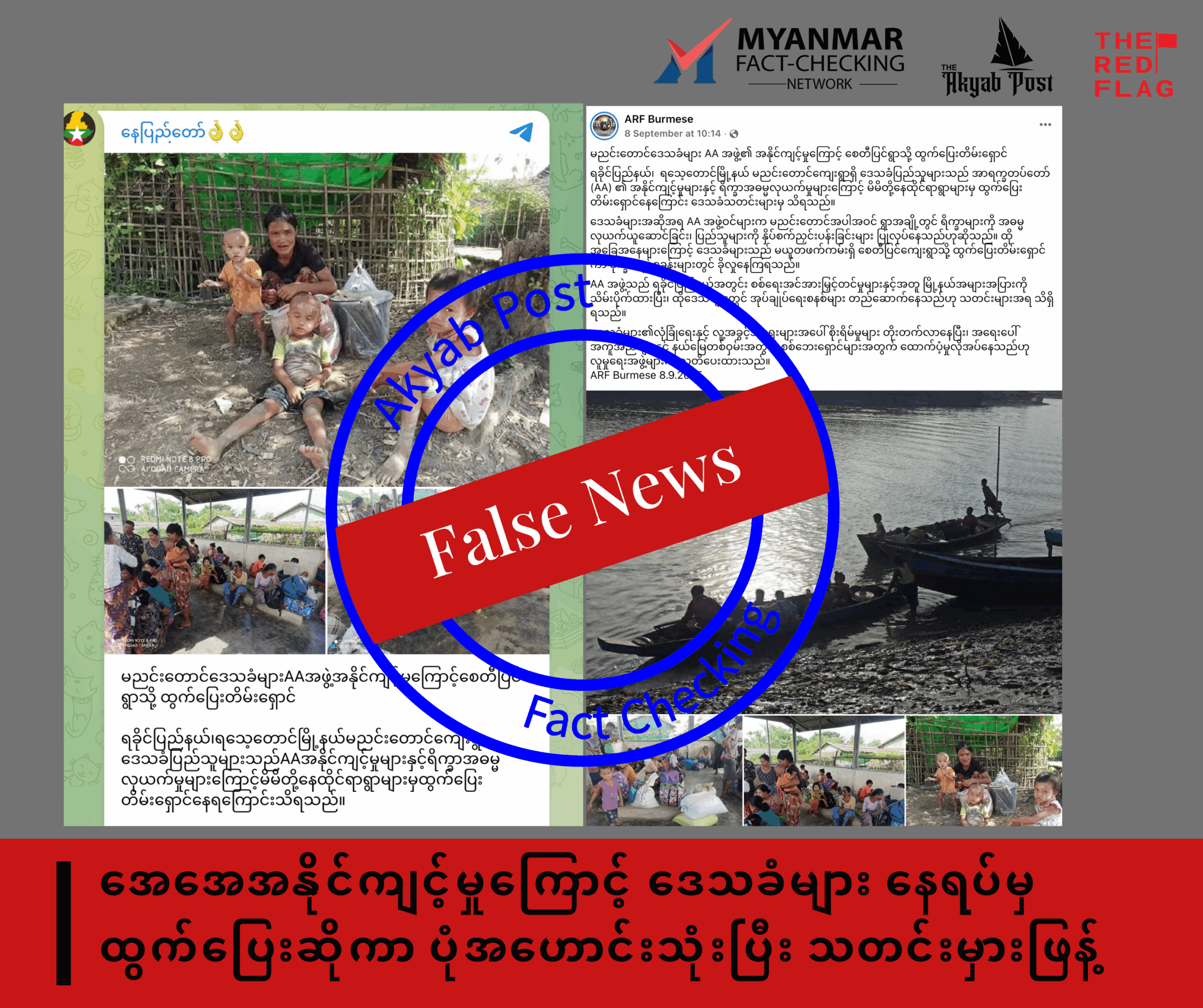 စစ်ကောင်စီဝါဒဖြန့်ချန်နယ်တွေမှာ ပျံ့နေတဲ့ ပို့စ်ကို Myanmar Fact-checking Network အဖွဲ့ဝင်ဖြစ်တဲ့ Akyab Post ကနေ စစ်ဆေးကြည့်လိုက်တဲ့အခါမှာ ယခင် ၂၀၂၂ နှစ်က စစ်ကောင်စီနဲ့ အာရက္ခတပ်တော်တို့ကြား တိုက်ပွဲတွေကြောင့် တိမ်းရှောင်လာရတဲ့ ဒေသခံရဲ့ပုံတွေဖြစ်နေပြီးတော့၊ ဝါဒဖြန့်ချန်နယ်တွေကနေ ပုံအဟောင်းကိုသုံးပြီးတော့ သတင်းမှားဖြန့်ခဲ့တာကို တွေ့ရပါတယ်။