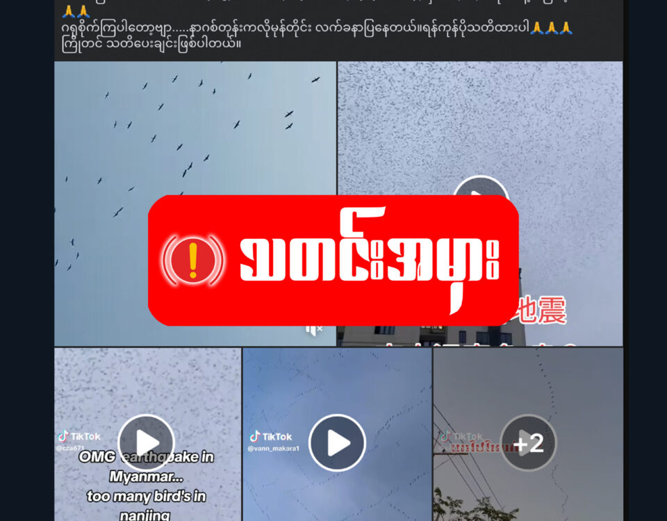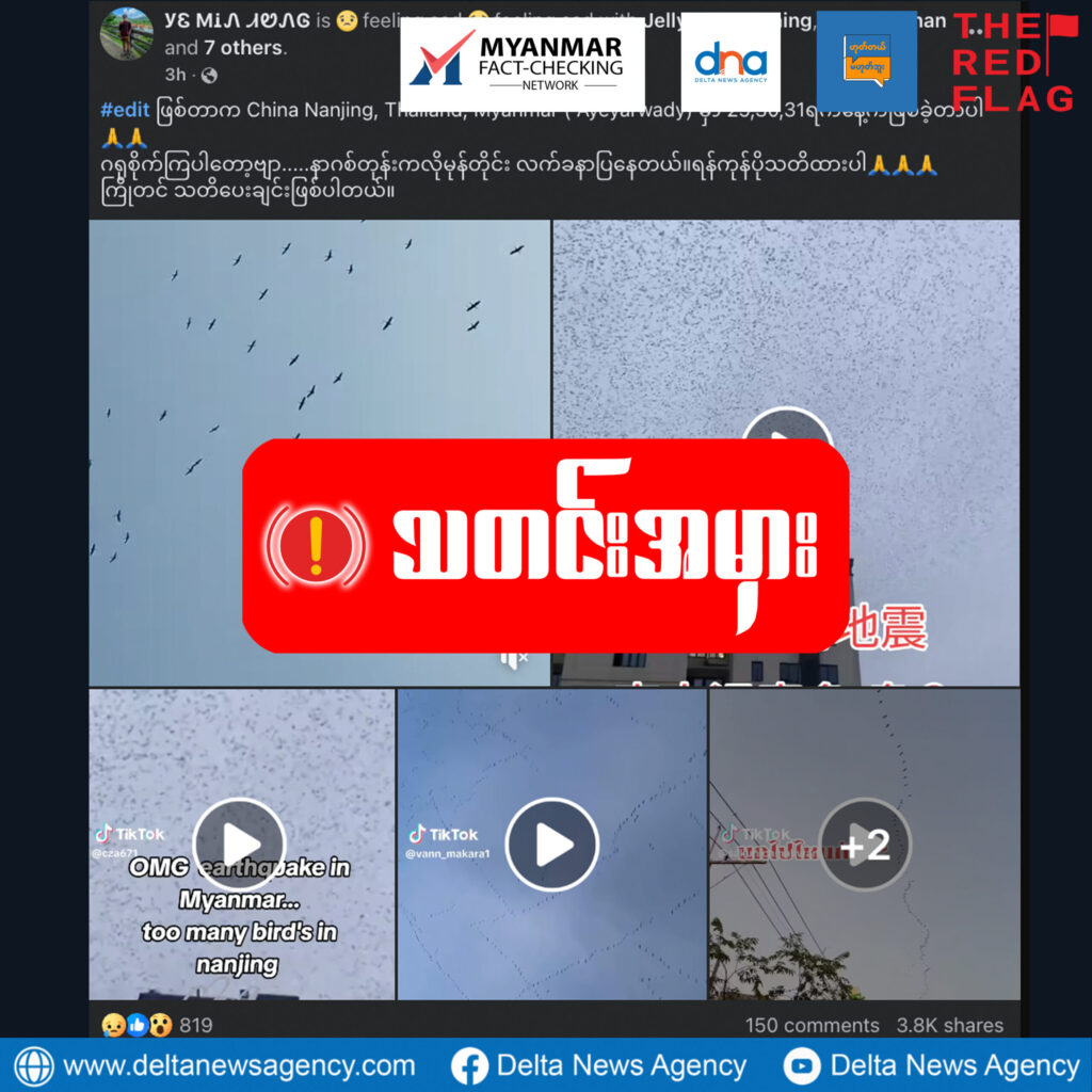 ၂၀၂၅ခုနှစ်၊ ဧပြီလ၊ ၁ရက်။ (Fact Check) DNA/ The Red Flag တရုတ်နိုင်ငံ၊ ထိုင်းနိုင်ငံနဲ့ မြန်မာနိုင်ငံမှာ ငှက်တွေအစုအဖွဲ့လိုက်ပျံသန်းနေတဲ့ ရုပ်သံတွေကိုအသုံးပြုပြီး မုန်တိုင်းလာတော့မယ့် လက္ခဏာလို့ရေးသားထားတဲ့ သတင်းတခု လူမှုကွန်ရက်စာမျက်နှာတွေမှာ ပျံ့နှံ့နေပါတယ်။ အဲ့ဒီပျံ့နှံ့နေတဲ့သတင်းကို ကြည့်ရှုသူများပြားနေပြီး ပြန်လည်မျှဝေသူ လေးထောင်နီးပါအထိရှိနေတာပါ။ သတင်းမှားလင့် – https://archive.ph/7mlt4 []
