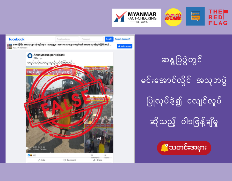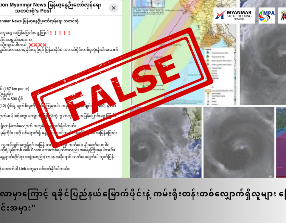 2 April 2025 By MPA+Shan News / The Red Flag ရခိုင်ပြည်နယ်‌မြောက်ပိုင်းနှင့် ကမ်းရိုးတန်းတစ်လျောက်ရှိ နေထိုင်သူများအနေဖြင့် မိုခါမုန်တိုင်းလာမှာကြောင့် အမြန်ပြောင်းရွေ့ကြရန်လိုအပ်ဆိုသည့် သတင်းအမှားအကြောင်းအရာတစ်ခု ဆိုရှယ်မီဒီယာတွင် ဧပြီ ၂ ရက်က ပျံ့နှံ့ခဲ့သည်။ U Naing Oo ဆိုသည့် ဖေ့ဘွတ်ခ် []