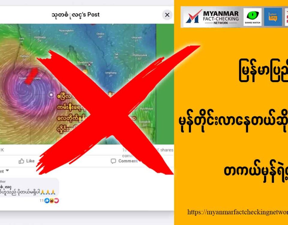 Dawei Watch၊ The Red Flag ၊ Fact Check ဧရာဝတီ၊ ရန်ကုန်၊ မန္တလေး၊ မွန်နဲ့ ကရင် စတဲ့ တိုင်းနဲ့ပြည်နယ်တွေကို မုန်တိုင်းလာနေပြီဆိုတဲ့ ဖော်ပြချက်တစ်ခု လူမှုကွန်ရက်မှာ ပျံ့နှံ့နေပါတယ်။ “မုန်တိုင်းလာနေပြီ ဧရာဝတီကို အဓိကထားလာမည် ရန်ကုန်၊ မန္တလေး၊ မွန်၊ ကရင် []