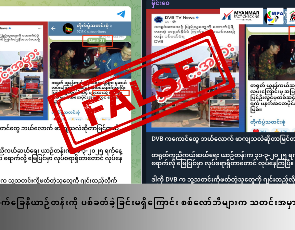 သျှမ်းသံတော်ဆင့်၊ MPA၊ The Red Flag ငလျင်ကြောင့် လူထောင်ချီ ဘေးသင့်နေချိန် နယ်စပ်မှတဆင့်ဝင်ရောက်လာသော တရုတ်ကြက်နီခြေ အဖွဲ့ယာဉ်တန်း ပစ်ခတ်ခံရခြင်းမှာ မဟုတ်မမှန်ကြောင်း စစ်လော်ဘီများက သတင်းအမှားဖြန့်ချိနေပါသည်။ စစ်ကောင်စီအာပေး တယ်လီဂရမ် ဝါဒဖြန့်ချန်နယ်တစ်ခုဖြစ်သည့် မှိုင်းဝေချန်နယ်က ဖြန့်ချိခဲ့ပြီး DVB သတင်းဌာနမှ ရေးသားဖော်ပြထားခဲ့သော “ငလျင်ဘေးသင့် ပြည်သူတွေကို ထောက်ပံ့ဖို့လာတဲ့ []
