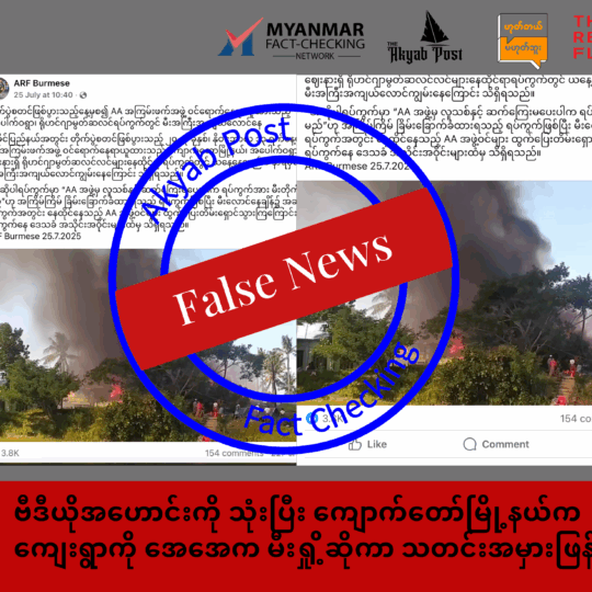 Akyab Post/ MFCN/ The Red Flag Fact Check 1 Aug 2025 အာရက္ခတပ်တော် သိမ်းပိုက်ထားတဲ့ ကျောက်တော်မြို့နယ် အပေါက်ဝကျေးရွာမှ ရိုဟင်ဂျာတွေနေထိုင်တဲ့ ရပ်ကွက်ကို လူသစ်နဲ့ ဆက်ကြေးမပေးတာကြောင့် အေအေတပ်သားတွေကနေ မီးရှို့ခဲ့တယ်ဆိုပြီးတော့ ရေးသားထားကြတဲ့ ပို့စ်တွေဟာ ဆိုရှယ်မီဒီယာပလက်ဖောင်းပေါ်မှာ ပျံ့နှံ့လျက်ရှိပါတယ်။ Facebook []