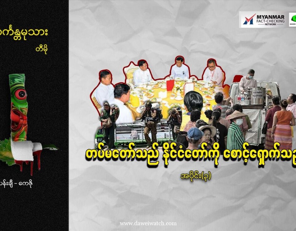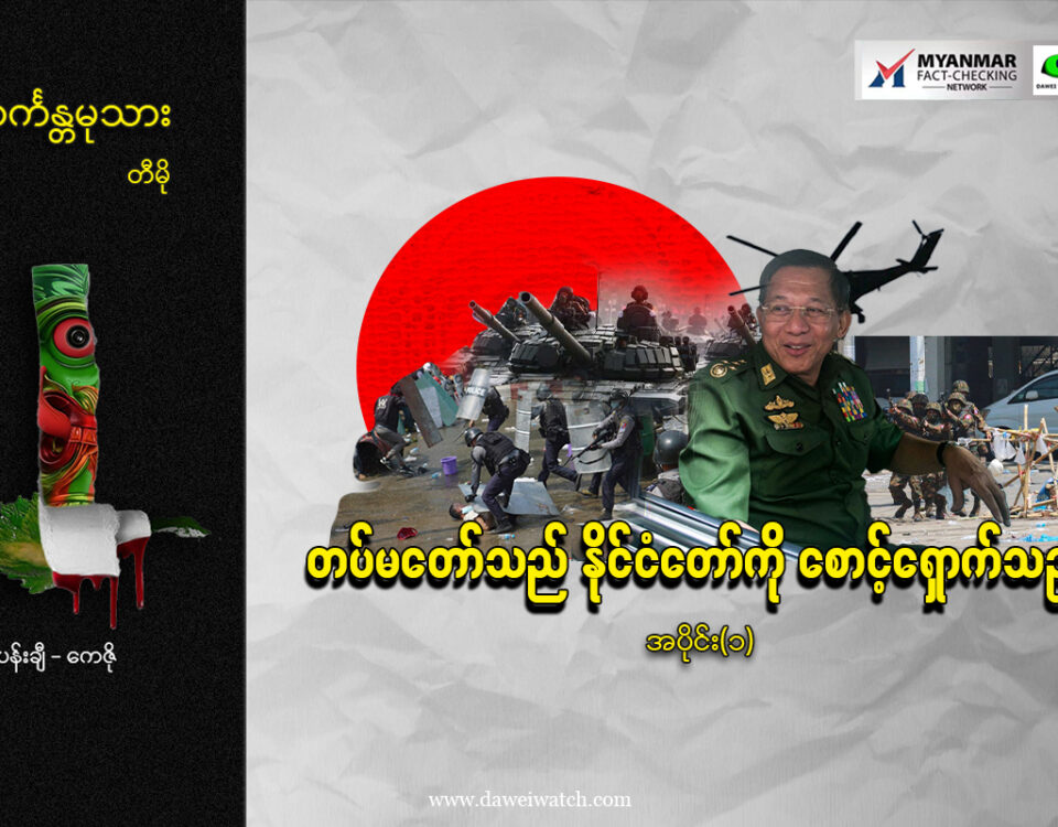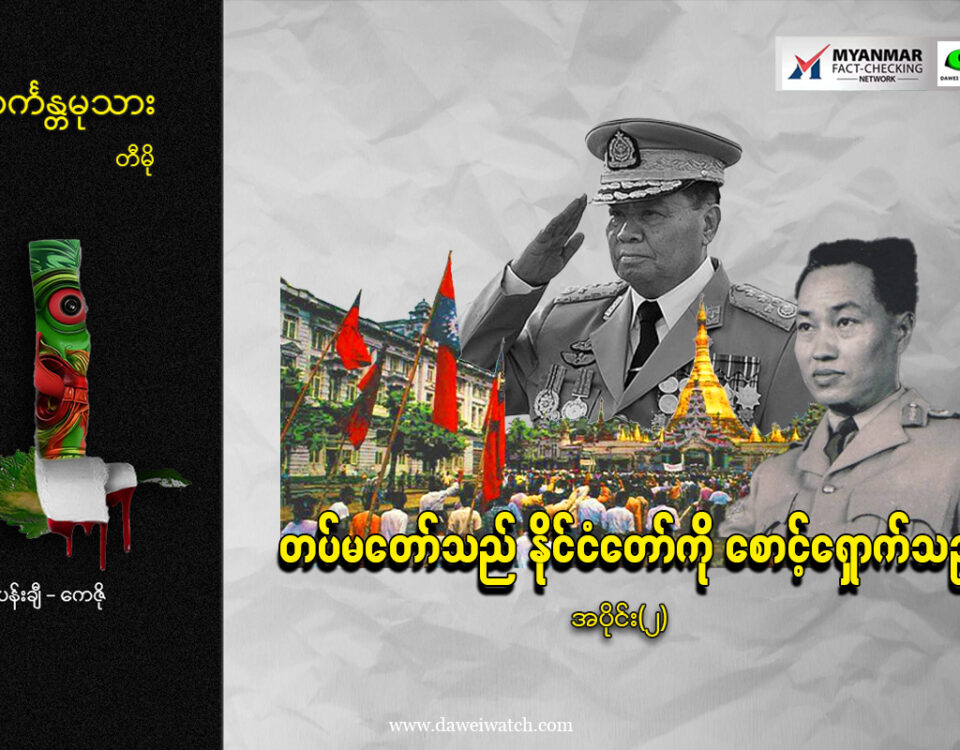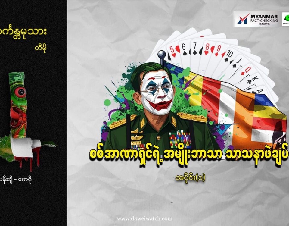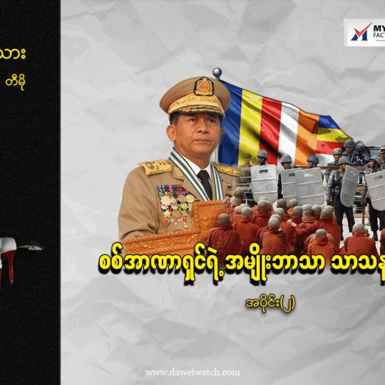စစ်အာဏာရှင်ရဲ့ အမျိုးဘာသာ သာသနာဖဲချပ် *********** (ယခုဆောင်းပါးမှာ မြန်မာ စစ်အာဏာရှင်တို့ သမိုင်းတစ်လျှောက် ပြည်သူလူထုကို ဦးနှောက်ဆေး လှည့်ဖျားရန် မည်သည့်နည်းများ အသုံးပြုခဲ့သည်ကို သုတေသနပြု ထုတ်ဝေထားသော ဝင်္ကန္တ မုသား သို့မဟုတ် မြန်မာ စစ်အာဏာရှင်၏ ဝါဒဖြန့်ဖဲချပ်များ စာတမ်းမှ ထုတ်နုတ်တင်ဆက်ခြင်း ဖြစ်ပါသည်။ တီမိုပြုစုတင်ပြသည့် ယင်းသုတသန []