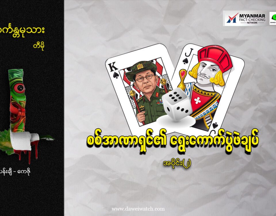 စစ်အာဏာရှင်ရဲ့ အမျိုးဘာသာ သာသနာဖဲချပ် *********** (ယခုဆောင်းပါးမှာ မြန်မာ စစ်အာဏာရှင်တို့ သမိုင်းတစ်လျှောက် ပြည်သူလူထုကို ဦးနှောက်ဆေး လှည့်ဖျားရန် မည်သည့်နည်းများ အသုံးပြုခဲ့သည်ကို သုတေသနပြု ထုတ်ဝေထားသော ဝင်္ကန္တ မုသား သို့မဟုတ် မြန်မာ စစ်အာဏာရှင်၏ ဝါဒဖြန့်ဖဲချပ်များ စာတမ်းမှ ထုတ်နုတ်တင်ဆက်ခြင်း ဖြစ်ပါသည်။ တီမိုပြုစုတင်ပြသည့် ယင်းသုတသန []