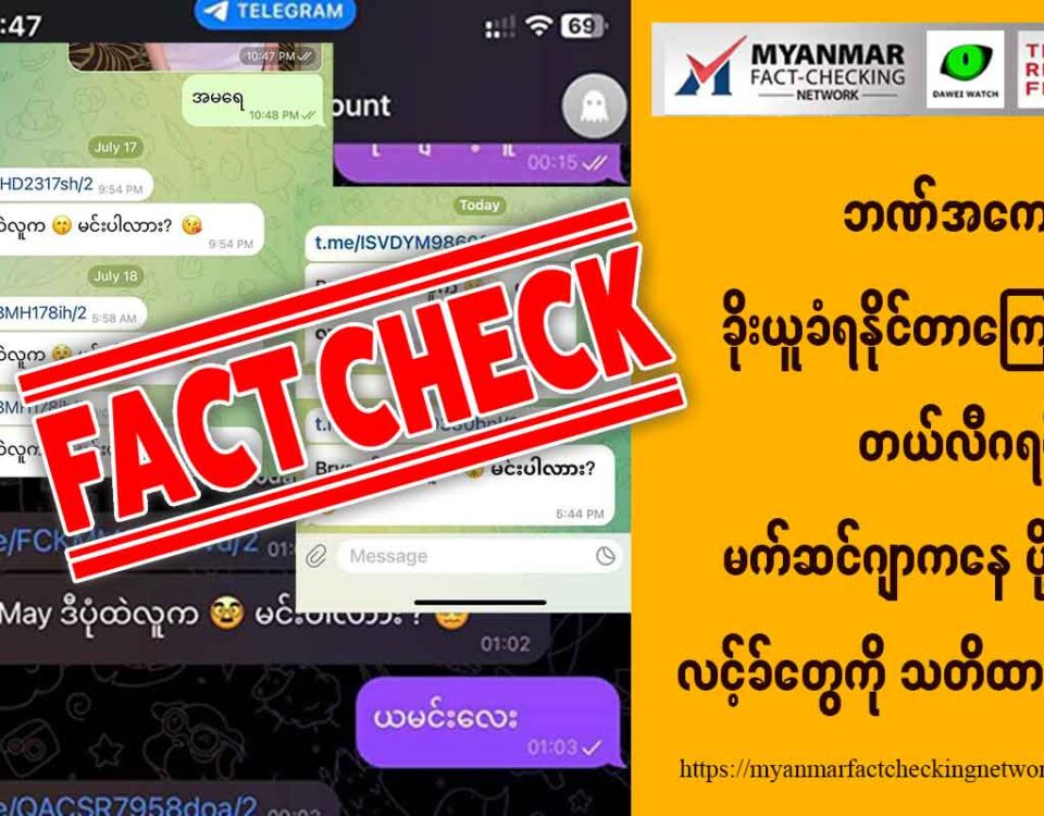 Factcheck Dawei Watch, The Red Flag တယ်လီဂရမ် (Telegram) အကောင့်နဲ့ Facebook မက်ဆင်ဂျာ (Messenger) တွေကနေ လင့်ခ် (Link) ပေးပို့ပြီး မိုဘိုင်း ဘဏ်အကောင့်တွေ ခိုးယူခံရတာတွေ ကြုံနေရပါတယ်။ ကိုယ်နဲ့ ရင်းနှီးသူရဲ့ လူမှုကွန်ရက်အကောင့် ခိုးယူခံရပြီး အဲဒီအကောင့်ကနေ ရင်းနှီးသူအယောင်ဆောင်ပြီး []