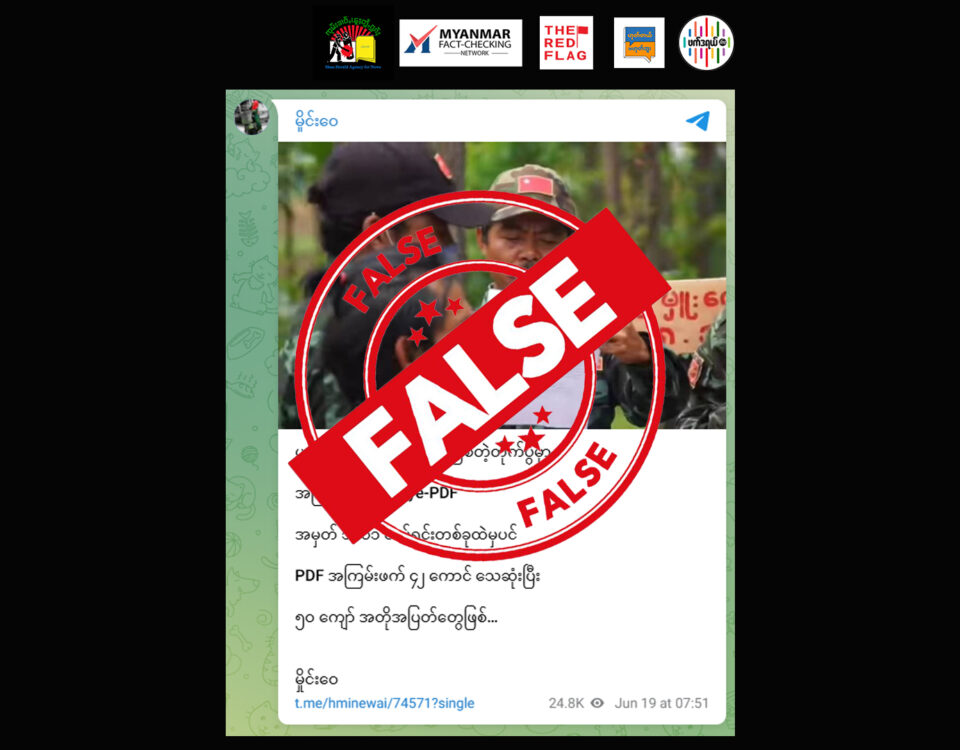 June 20, 2025 By Myanmar Pressphoto Agency+Karen Information Center- The Red Flag အာဏာသိမ်း စစ်ကောင်စီအတွက် စစ်မှုထမ်းရန် အမျိုးသမီးစာရင်းကောက်ခံမှုသည် သတင်းအမှားသာ ဖြစ်ကြောင်း စစ်ကောင်စီတပ် ဝါဒဖြန့် တယ်လီဂရမ်ချန်နယ်များက ဖြန့်ဝေလျက်ရှိသည်။ သတင်းအချက်အလက်စစ်ဆေးရေးအဖွဲ့ အယောင်ဆောင် စစ်ကောင်စီဝါဒဖြန့် “Fact []