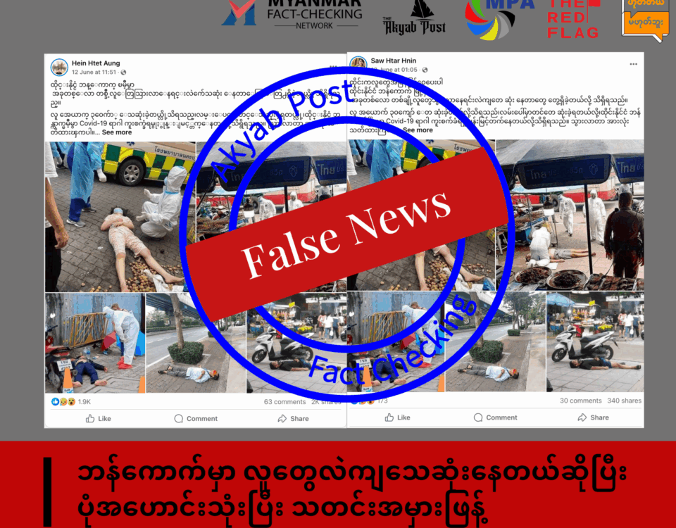 Akyab Post/ MPA/ MFCN 22 Jun 2025 Fact Check ထိုင်းနိုင်ငံ ဘန်ကောက်က လမ်းတွေမှာ အခုရက်ပိုင်းအတွင်းမှာ ကိုဗစ်ရောဂါကူးစက်ခံရတာကြောင့် လူတွေလဲကျသေဆုံးနေတာရှိပြီး သတိထားဖို့လိုတယ် ဆိုပြီးတော့ ရေးသားထားတဲ့ ပို့စ်တွေဟာ ဆိုရှယ်မီဒီယာဖြစ်တဲ့ ဖေ့စဘုတ်စာမျက်နှာမှာ ပျံ့နှံ့လျက်ရှိပါတယ်။​ ဖေ့စဘုတ်မှာ Followers ၅၁၀၀ ကျော်ရှိတဲ့ []