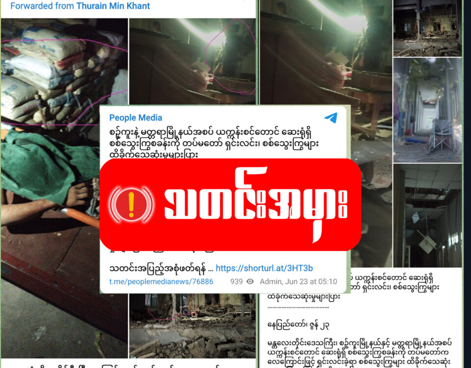23 June 2025 / MFCN /MPA / DNA စဉ့်ကူး နှင့် မတ္တရာမြို့နယ် အစပ် ယက္ကန်းစင်တောင်ဆေးရုံရှိ PDF စခန်းကို စစ်ကောင်စီက ဗုံးကြဲရှင်းလင်း ဆိုသည့် အကြောင်းအရာသည် စစ်ကောင်စီဝါဒဖြန့် တယ်လီဂရမ်ချန်နယ်များတွင် ပျံ့နှံ့ခဲ့သည်။ “People Media” တယ်လီဂရမ်ချန်နယ်က ဇွန် []