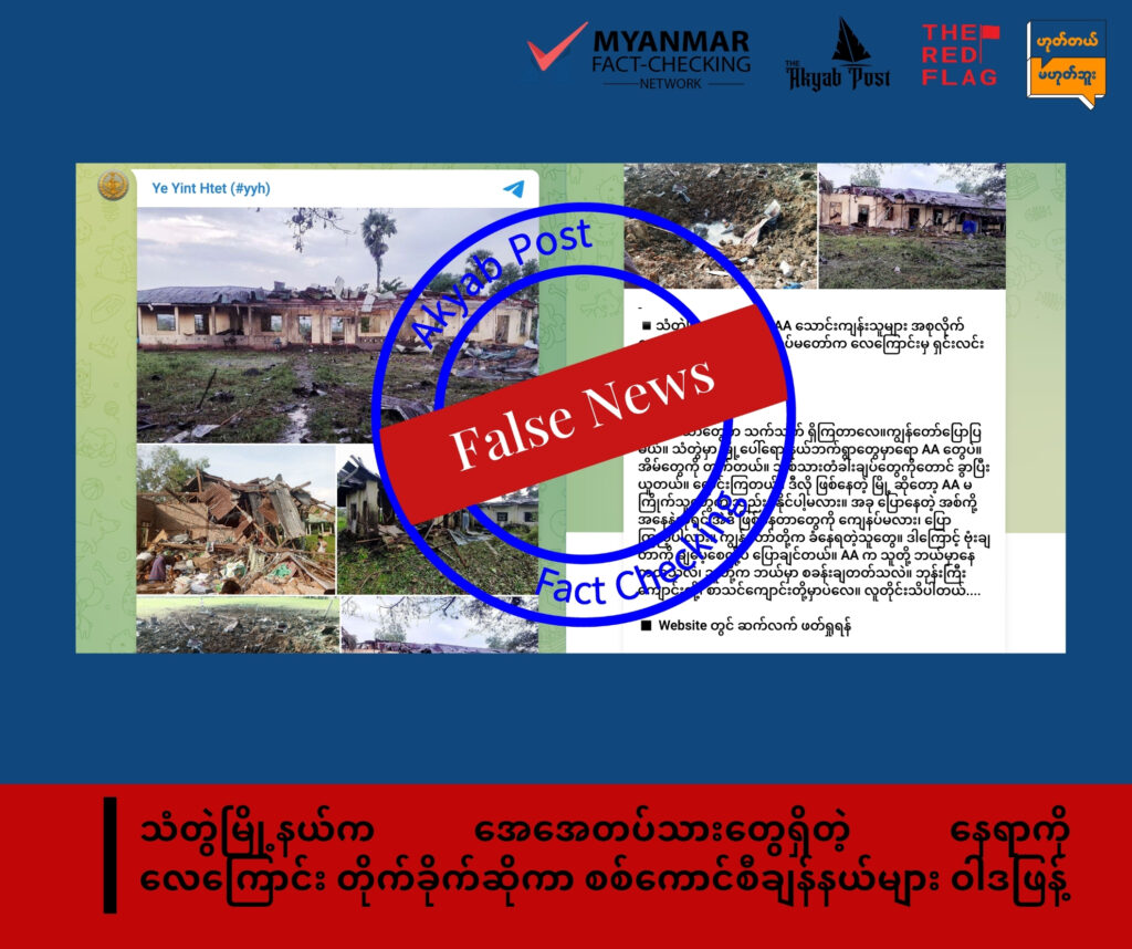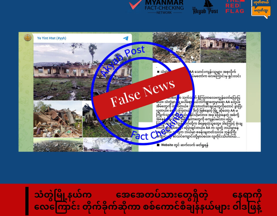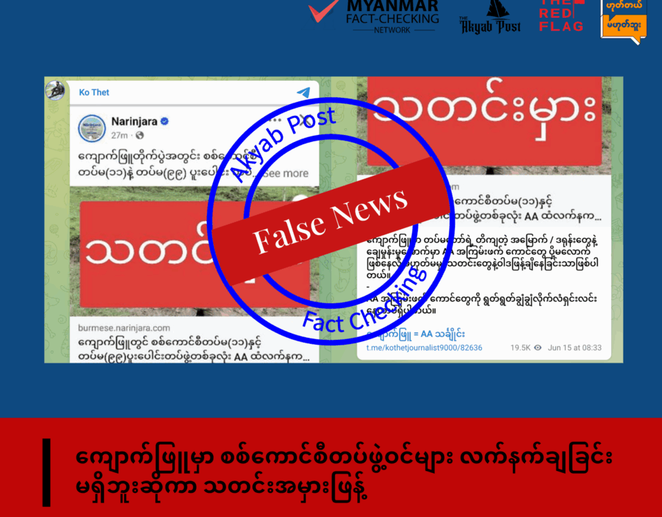 Akyab Post/ MFCN Fact Check 19 Jun 2025 ရခိုင်ပြည်၊ ကျောက်ဖြူမြို့နယ်တိုက်ပွဲတွေမှာ စစ်ကောင်စီရဲ့ တပ်သားတွေ လက်နက်ချတယ်ဆိုတာ သတင်းမီဒီယာဌာနတွေကနေ မဟုတ်မမှန်စွပ်စွဲပြီးတော့ သတင်းမှားဖြန့်နေတာသာ ဖြစ်တယ်ဆိုပြီးတော့ ရေးသားထားတဲ့ ပို့စ်ဟာ စစ်ကောင်စီဝါဒဖြန့်ချန်နယ်တွေမှာ ပျံံ့နှံံ့လျက်ရှိပါတယ်။​ စစ်ကောင်စီဝါဒဖြန့်ချန်နယ်တွေဖြစ်ကြတဲ့ Ko Thet ချန်နယ်ကနေ ဇွန်လ []