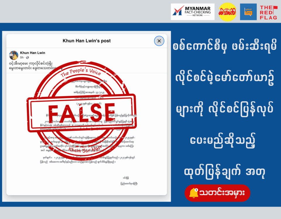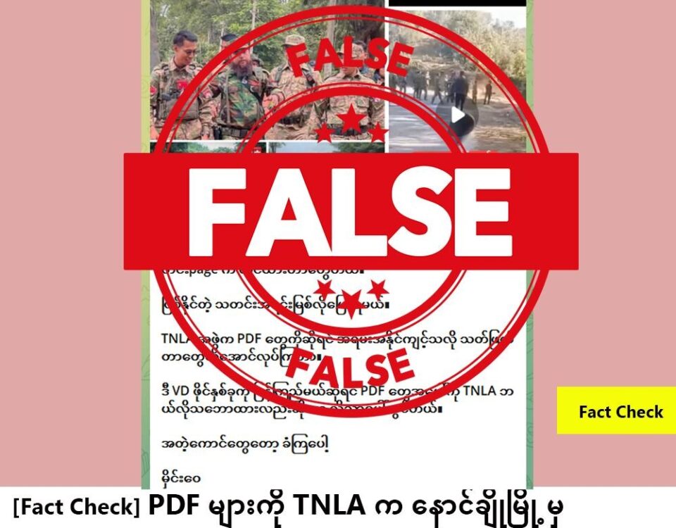 June 12, 2025 By Myanmar Pressphoto Agency + Shan News – The Red Flag ရှမ်းပြည်နယ် နောင်ချိုမြို့အနီးတဝိုက်ရှိ TNLA ထိန်းချုပ်နယ်မြေအတွင်းမှ PDF များကို ထွက်ခွာခိုင်းဆိုသည့် သတင်းအမှားများ ဆိုရှယ်မီဒီယာများတွင် ပျံ့နှံ့လျက်ရှိသည်။ ဖေ့ဘွတ်ခ်ပေ့ချ် အချို့နှင့် []