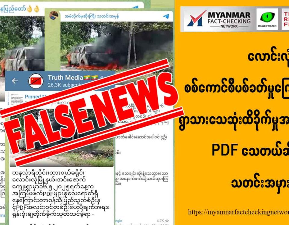 Fact Check၊ Dawei Watch/The Red Flag လောင်းလုံးမြို့နယ်၊ သာယာကုန်းကျေးရွာအုပ်စု၊ အင်းဝန်းရွာကို မေလ ၁၆ရက်မှာ စစ်ကောင်စီတပ်က ဒရုန်း၊ လက်နက်ကြီးနဲ့ ပစ်ခတ်တိုက်ခိုက်ခဲ့တာကြောင့် ကားတစ်စီးမီးလောင်ခဲ့သလို အမျိုးသားတစ်ဦးသေဆုံးပြီး နှစ်ဦးဒဏ်ရာရတဲ့ဖြစ်စဥ် ဖြစ်ခဲ့ပါတယ်။ အဲဒီဖြစ်စဥ်ကိုအခြေခံပြီး စစ်ကောင်စီဝါဒဖြန့်တယ်လီဂရမ်ချန်နယ်တွေဖြစ်တဲ့ “အမဲလိုက်မုဆိုးကြီး သတင်းမှန်” ၊ “နေပြည်တော်” ၊ []