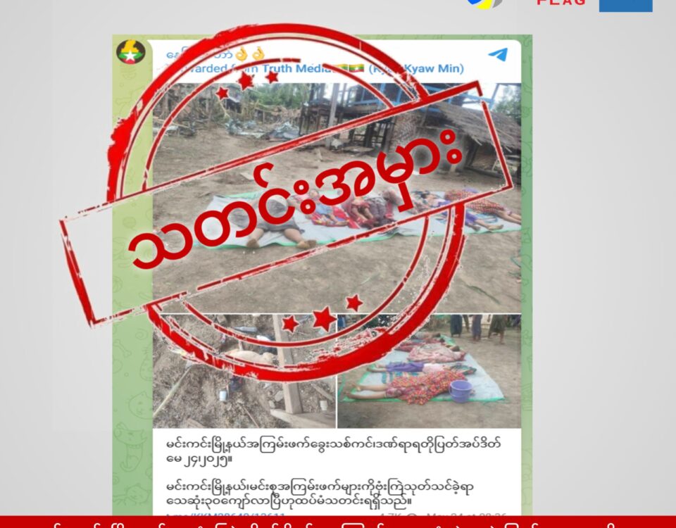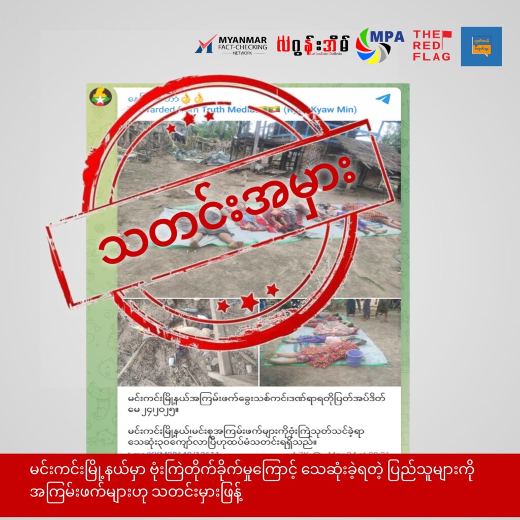 ၂၀၂၅၊ မေလ ၂၆ ရက်။ (fact-check) MPA/ လဂွန်းအိမ်/ The Red Flag စစ်ကိုင်းတိုင်း၊ မင်းကင်းမြို့နယ်၊ မင်းစုကျေးရွာကို စစ်ကောင်စီတပ်က လေကြောင်းကနေ ဗုံးကြဲတိုက်ခိုက်ခဲ့မှု အတွင်း သေဆုံးခဲ့ရတဲ့ ဒေသခံ ပြည်သူများကို အကြမ်းဖက်များဟု စစ်တပ်လော်ဘီ ချန်နယ်တွေက ဝါဒဖြန့် နေတာကို တွေ့ရပါတယ်။ []
