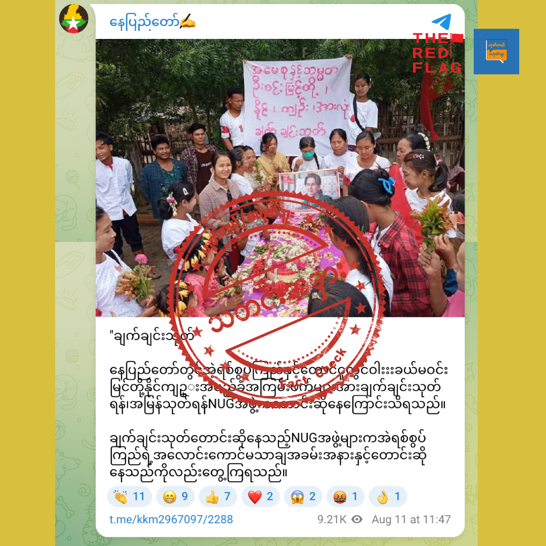 စစ်ကောင်စီဝါဒဖြန့် တယ်လီဂရမ်ချယ်နယ်တခု ဖြစ်တဲ့ နေပြည်တော် တယ်လီဂရမ်ချယ်နယ်ကနေ ဒေါ် အောင်ဆန်းစုကြည်နဲ့ပတ်သက်ပြီး ပုံဖျက်တိုက်ခိုက်ထားတဲ့ အကြောင်းအရာတခုကို ဖြန့်ဝေနေတာကို တွေ့ရပါတယ်။ ဖြန့်ဝေထားတဲ့အကြောင်းအရာကတော့ ဒေါ်အောင်ဆန်းစုကြည်ရဲ့ နှစ် ၈၀ ပြည့် မွေးနေ့ပွဲလုပ်တုန်းက ပုံကိုပြုပြင်ပြီး ဒေါ်အောင်ဆန်းစုကြည် နိုင်ငံတော်သမ္မတ ဦးဝင်းမြင့်အပါအဝင် နိုင်ကျဉ်းတွေကို အမြန်သတ်ဖို့အတွက် NUG အဖွဲ့က တောင်းဆိုနေတယ်ဆိုတဲ့ ဇာတ်ကြောင်းနဲ့ ပုံဖျက် တိုက်ခိုက်ထားတာဖြစ်ပါတယ်။ အဲ့ဒီပို့စ်ဟာ ပျံ့နှံ့မှုအနေနဲ့ View ၉ထောင်ကျော်နဲ့ပျံံနှံ့နေတာဖြစ်ပါတယ်။ ဖြန့်ဝေထားတဲ့အကြောင်းအရာကို ဒီလင့်ခ်မှာသွားကြည့်နိုင်ပါတယ်။