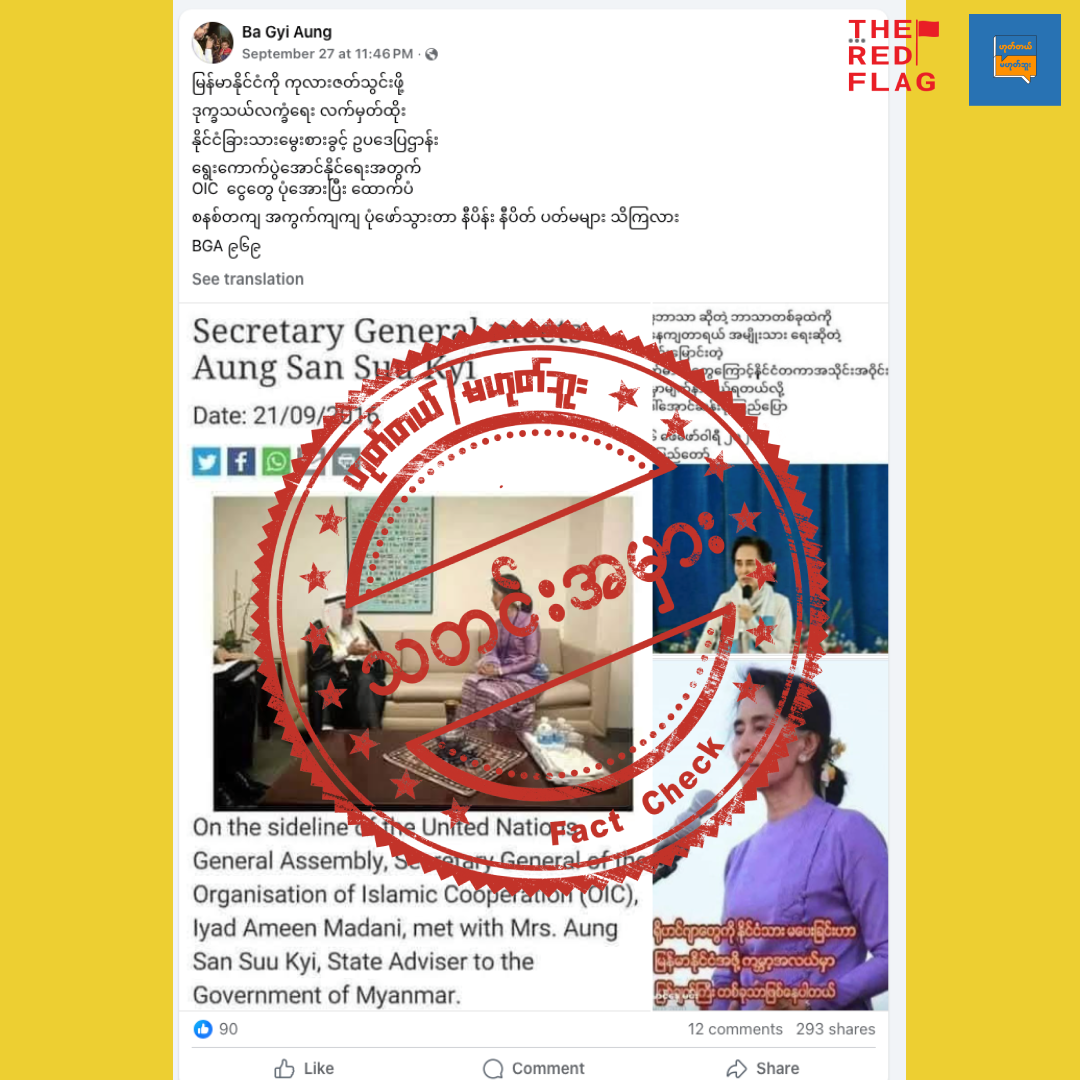 လူမှုမီဒီယာဖေ့ဘွတ်ခ်စာမျက်နှာပေါ်မှာ Ba Gyi အမည်နဲ့ ဖွင့်လှစ်ထားတဲ့ အကောင့်ကနေ စက်တင်ဘာ ၂၇ရက်နေ့တုန်းက “မြန်မာနိုင်ငံကို ကုလားဇတ်သွင်းဖို့ ဒုက္ခသယ်လက္ခံရေး လက်မှတ်ထိုးနိုင်ငံခြားသားမွေးစားခွင့် ဥပဒေပြဌာန်း ရွေးကောက်ပွဲအောင်နိုင်ရေးအတွက် OIC ငွေတွေ ပုံအေားပြီး ထောက်ပံစနစ် အကွက်ကျကျ ပုံဖော်သွားတာ နီပိန်း နီပိတ် ပတ်မများ သိကြလား ” (မူရင်းသတ်ပုံအတိုင်း) စာသားတွေနဲ့အတူ ဒေါ်အောင်ဆန်းစုကြည်ရဲ့ ဓာတ်ပုံတွေကို ပူးတွဲချိတ်ဆက်ရေး သားဖြန့်ဝေထားတာ ဖြစ်ပါတယ်။ အဲ့ဒီပို့စ်ဟာ Share ပြုလုပ်သူ ၂၉၀ကျော်နဲ့ပျံ့နှံ့နေပါတယ်။