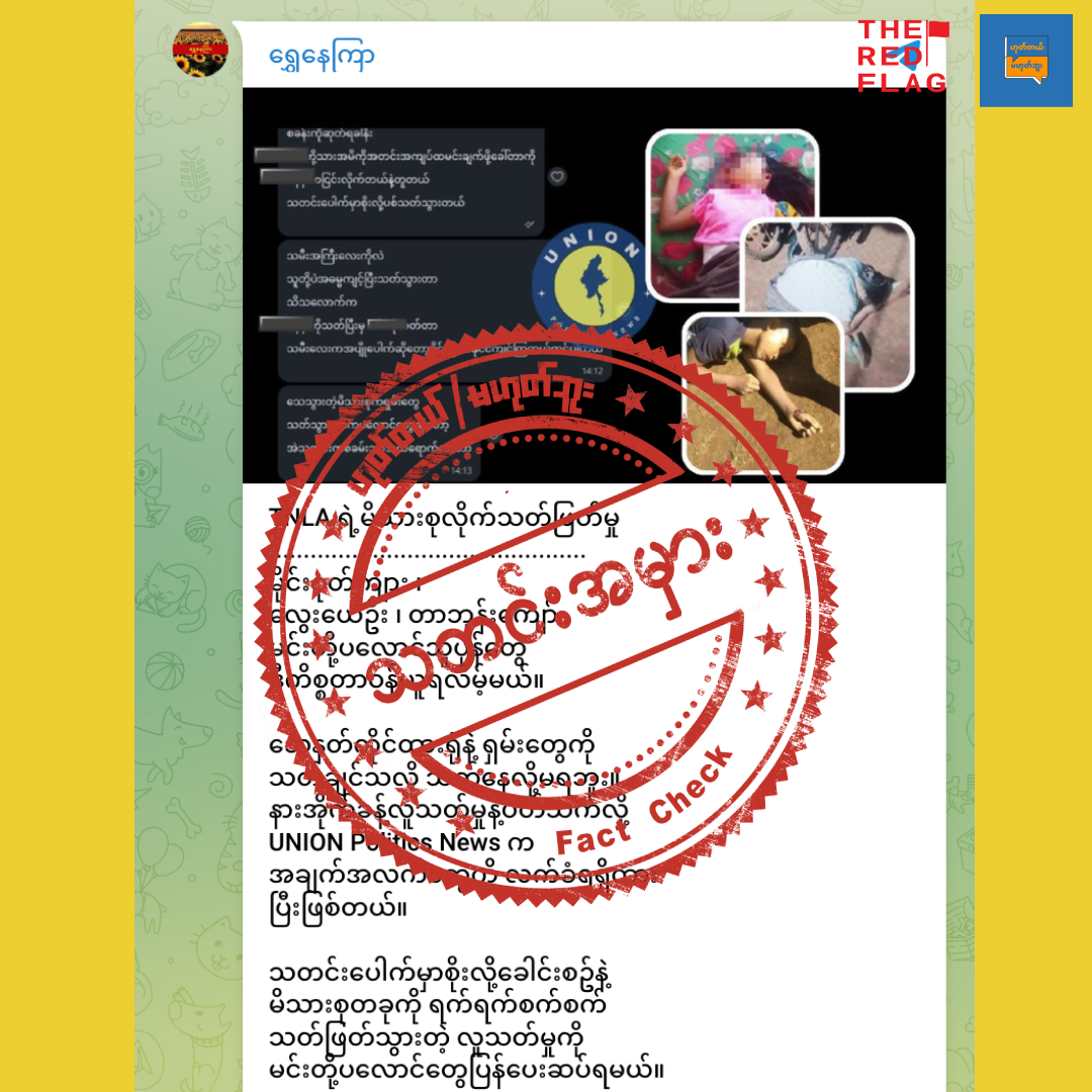 စစ်တပ်ဝါဒဖြန့်တယ်လီဂရမ်ချယ်နယ်က ဖြန့်ဝေနေတဲ့ “နားအိုက်ခန့်ရွာရှိ မိသားစု ၃ဦးကို TNLA က သတ်ဖြတ်သွားတယ်ဆိုတဲ့အကြောင်းအရာသည်” မှားယွင်းချိတ်ဆက်ပြီး လုပ်ကြံဖန်တီးထားတဲ့ သတင်းမှား ဖြစ်ကြောင်းကို ဟုတ်တယ် Vs မဟုတ်ဘူးအဖွဲ့က အချက်အလက်စိစစ်ထားပါတယ်။
