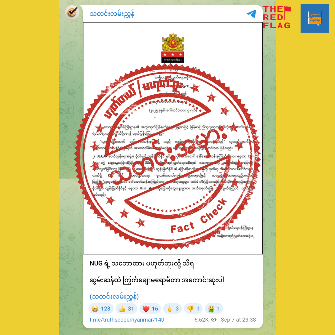 ဟုတ်တယ် Vs မဟုတ်ဘူး အချက်အလက်စစ်ဆေးသူတွေဟာ တယ်လီဂရမ်ချယ်နယ်တခုမှာ ပျံ့နှံ့နေတဲ့ ထုတ်ပြန်ချက်တခုကို အချက်အလက်စစ်ဆေးထားပါတယ်။ အဲ့ဒီထုတ်ပြန်ချက်အတုကို သတင်းလမ်းညွှန်ဆိုတဲ့နာမည်နဲ့ဖွင့်လှစ်ထားတဲ့တယ်လီဂရမ်ချယ်နယ်ကနေဖြန့်ဝေထားပြီးတော့ NUGအစိုးရကာကွယ်ရေးဝန်ကြီးဌာနကထုတ်ပြန်တဲ့ပုံစံနဲ့ဖြန့်ဝေထားတာဖြစ်ပါတယ်။ထုတ်ပြန်ချက်မှာပါဝင်တဲ့အကြောင်းအရာတွေကတော့ဒေါ်အောင်ဆန်းစုကြည်ကျန်းမာရေးဆိုးရွားနေတယ်ဆိုတာမဟုတ်ကြောင်း၊ဗိုလ်ချုပ်ထွန်းမြတ်နိုင်နဲ့ဒေါ်အောင်ဆန်းစုကြည်ရဲ့သားအငယ်ကမ်အဲရစ်တို့တွေ့ဆုံဆွေးနွေးပြောဆိုမှုကိုအသိအမှတ်မပြုကန့်ကွက်တယ်တဲ့အကြောင်းအရာဖြစ်ပါတယ်။ဖြန့်ဝေထားတဲ့အကြောင်းအရာ ကို ဒီလင့်ခ် မှာ ကြည့်ရှုနိုင်ပါတယ်။