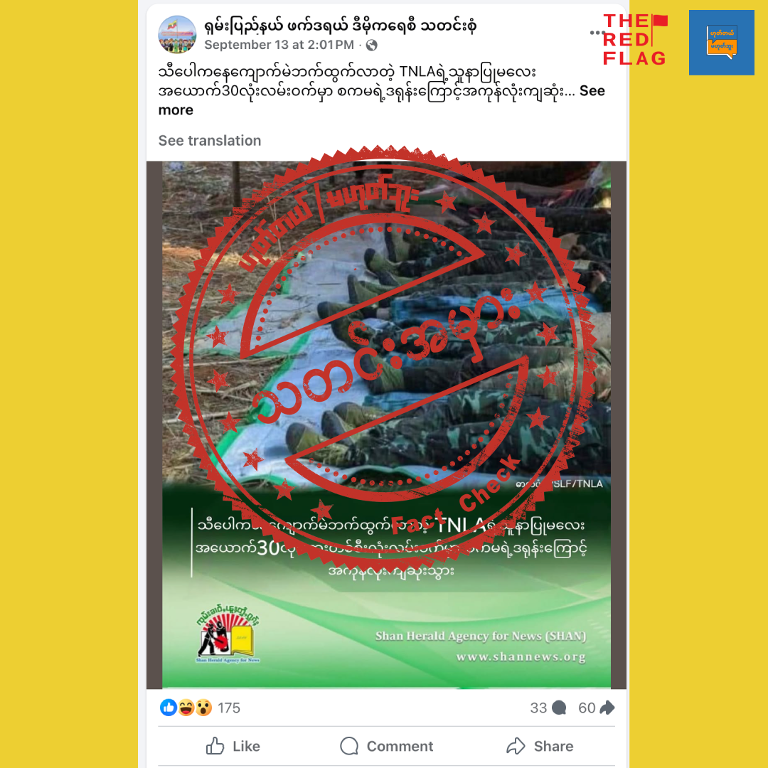 TNLA ရဲ့ သူနာပြုဆရာမ အယောက် ၃၀ စကမ ရဲ့ ဒရုန်းကြောင့် အကုန်ကျဆုံးသွားတယ်ဆိုပြီး ဖြန့်ဝေနေတဲ့ သတင်းအကြောင်းအရာတခုဟာ လူမှုမီဒီယာဖေ့ဘွတ်ခ်ပေါ်မှာပျံ့နှံ့နေတာကို ဟုတ်တယ် Vs မဟုတ်ဘူး အဖွဲ့ကတွေ့ရှိထားပါတယ်။ အဲ့ဒီအကြောင်းအရာကို စတင်ဖြန့်ဝေထားတဲ့ စာမျက်နှာက တော့ “ရှမ်းပြည်နယ် ဖက်ဒရယ် ဒီမိုကရေစီ သတင်းစုံ” ဆိုတဲ့နာမည်နဲ့ဖွင့်လှစ်ထားတဲ့စာမျက်နှာဖြစ်ပြီး စက်တင်ဘာ ၁၃ ရက်နေ့က ဖြန့်ဝေထားတာဖြစ်ပြီး စစ်တပ်လော်ဘီ စာမျက်နှာတချို့ကပါ ကော်ပီယူတင်ပြီး ပြန်လည်ဖြန့်ဝေနေကြပါတယ်။ ဒီအကြောင်းအရာဟာ ပျံ့နှံ့မှုအားကောင်းနေပြီး မှတ်ချက်တွေထဲမှာဆိုရင် လူမျိုးရေးအရ အမုန်းစကားပြောဆိုမှုတွေပါ ရှိနေတာတွေ့ရှိရပါတယ်။ ဖြန့်ဝေထားတဲ့ပို့စ်တွေကိုအောက်ကလင့်ခ်မှာ ဖတ်ရှုနိုင်ပါတယ်။
