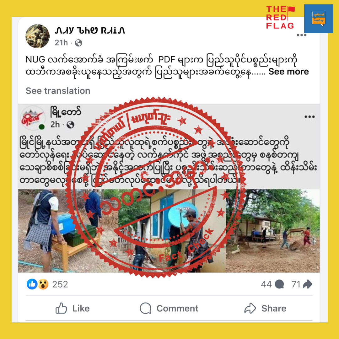 NUG လက်အောက်ခံ PDF တွေဟာ ပြည်သူပိုင်ပစ္စည်းတွေကို ခိုးယူနေတဲ့အတွက် ပြည်သူတွေအနေနဲ့ အခက်တွေ့နေတယ်ဆိုတဲ့ ဇာတ်ကြောင်းနဲ့ ဖြန့်ဝေနေတဲ့ အကြောင်းအရာတခု ဖေ့ဘွတ်ခ်ပေါ်မှာ ပျံ့နှံ့နေတာကို ဟုတ်တယ် Vs မဟုတ်ဘူး အဖွဲ့က သတိပြုမိခဲ့ပါတယ်။ ဖြန့်ဝေထားတဲ့အကြောင်းအရာကတော့ “NUG လက်အောက်ခံ အကြမ်းဖက် PDF များက ပြည်သူပိုင်ပစ္စည်းများကို ထဘီကအစခိုးယူနေသည့်အတွက် ပြည်သူများအခက်တွေ့နေ..တချို့PDFတွေဆိုရင် လှေကားအခြေမှာရှိတဲ့ အုန်းဆံခြေသုတ်ခုံများကိုပင် ဓါးပြတိုက်ယူနေ” ဆိုတဲ့စာသားနဲ့အတူ လက်နက်ကိုင်ဆောင်ထားတဲ့သူအချို့က ပစ္စည်းတွေရွှေ့ပြောင်းနေတဲ့ ပုံတွေပါဝင်သော Screenshot တခုနဲ့ အတူပူးတွဲဖြန့်ဝေထားတာဖြစ်ပါတယ်။ ဖြန့်ဝေထားတဲ့ အကြောင်းအရာကို အောက် က လင့်ခ်မှာ ဝင်ရောက်ကြည့်ရှုနိုင်ပါတယ်။