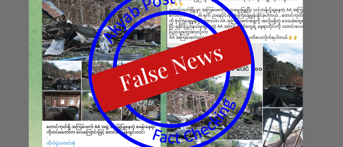 စစ်ကောင်စီဝါဒဖြန့်ချန်နယ်တွေမှာ ပျံ့နှံ့လျက်ရှိတဲ့ ပို့စ်ကို Myanmar Fact-checking Network အဖွဲ့ဝင်ဖြစ်တဲ့ Akyab Post ကနေ စစ်ဆေးကြည့်တဲ့အခါ လေကြောင်းတိုက်ခိုက်မှုကြောင့် ပျက်ဆီးသွားတဲ့ နေရာမှာ အေအေရဲ့စစ်စခန်း သင်တန်းကျောင်း မဟုတ်ဘဲ အရပ်ဖက်ဘုန်းတော်ကြီး ကျောင်းတစ်ကျောင်း ဖြစ်နေတာကိုသာ တွေ့ရပါတယ်။