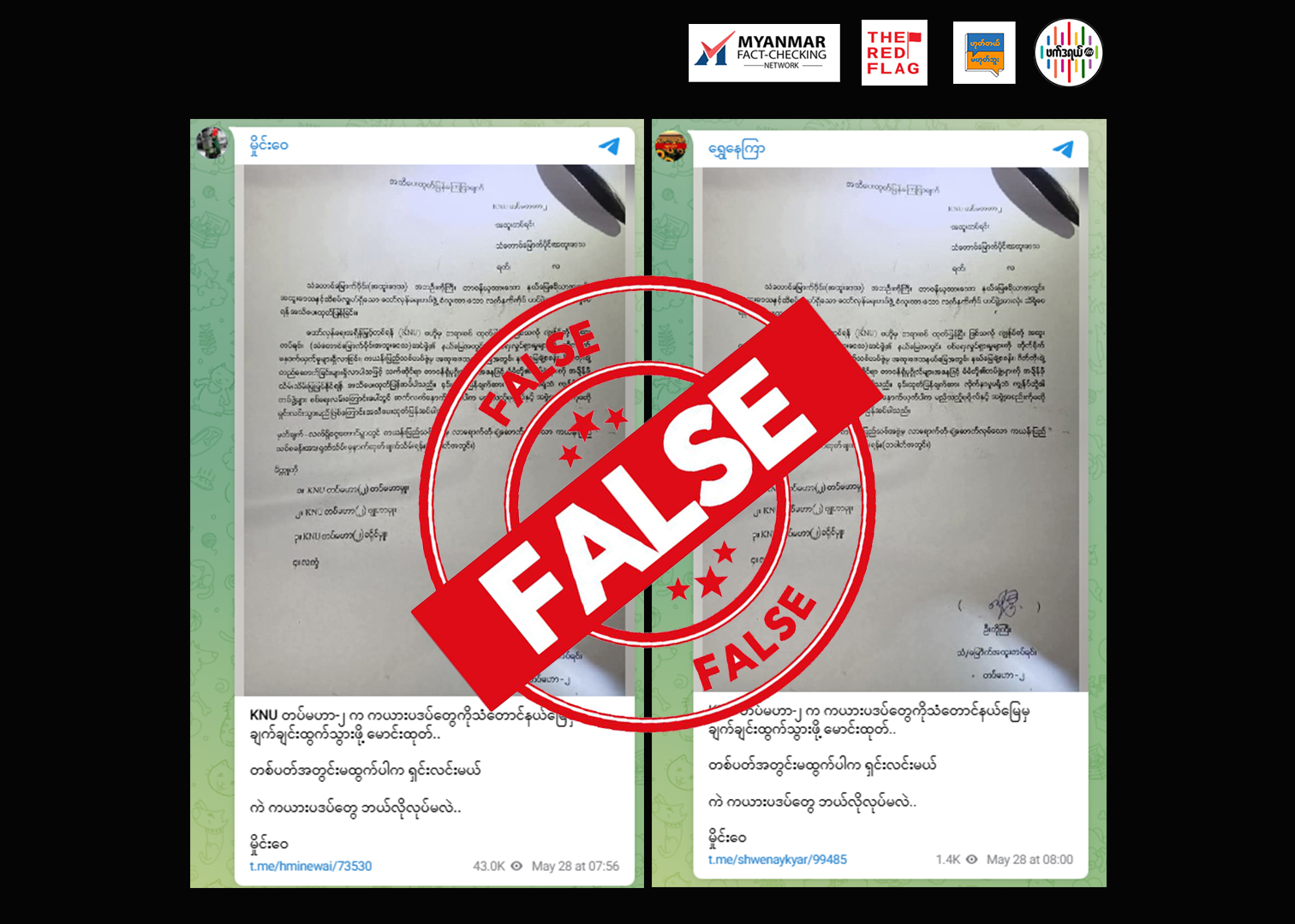 KNU တပ်မဟာ-၂ က ကယား PDF တွေကိုသံတောင်နယ်မြေမှ ချက်ချင်းထွက်သွားဖို မောင်းထုတ်ပြီး တစ်ပတ်အတွင်းမထွက်ပါက ရှင်းလင်းမယ်ဆိုတဲ့ သတင်းအမှားဟာ မနေ့ မေလ ၂၈ ရက်နေ့က မှိုင်းဝေတယ်လီဂရမ်ချန်နယ်က စတင်ပျံ့နှံ့ခဲ့ပြီး ကြည့်ရှုသူ နှစ်သောင်းနီးပါးရှိနေတာကို တွေ့ရှိရပါတယ်။