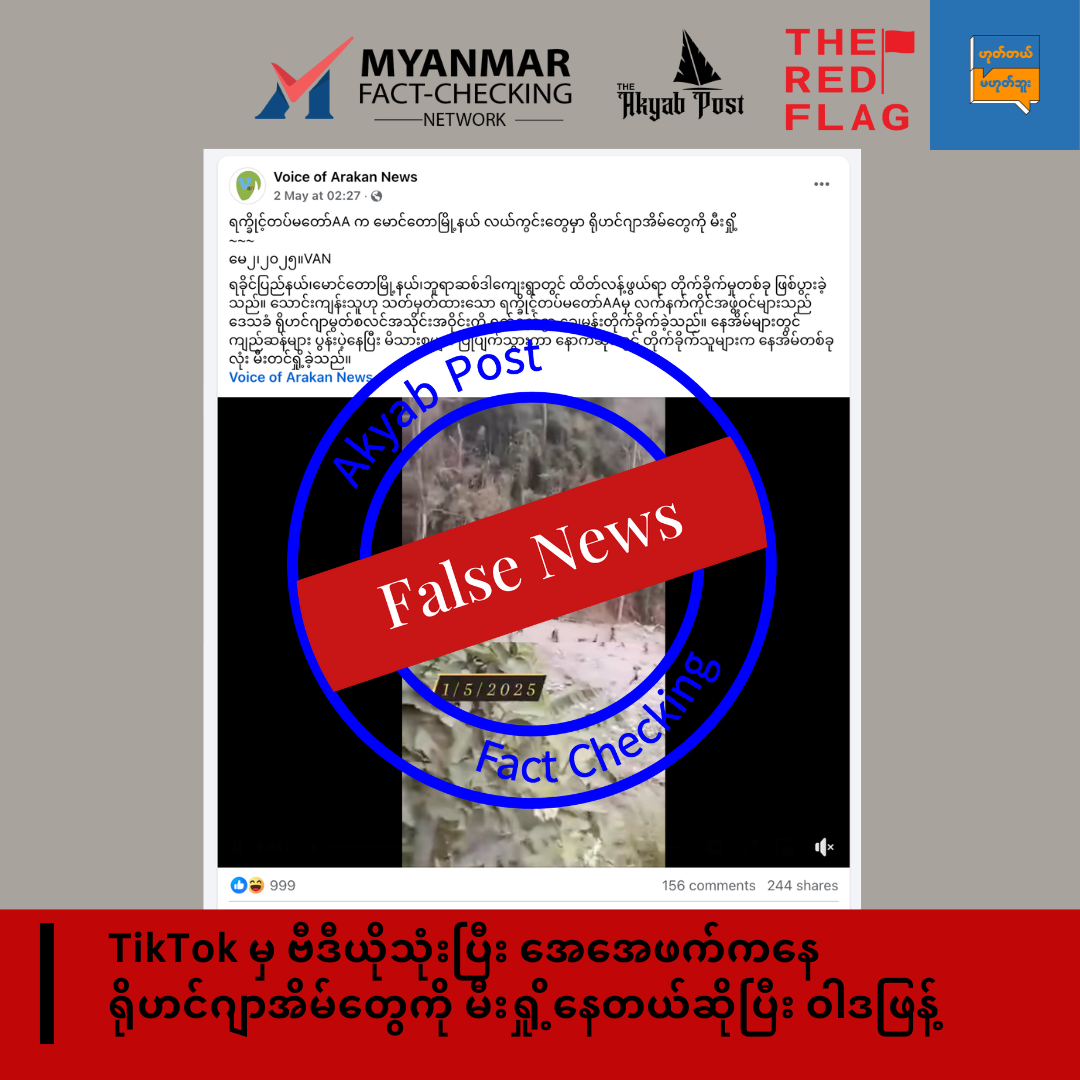 ဒီပို့စ်ကို Myanmar Fact Checking Network အဖွဲ့ဝင်ဖြစ်တဲ့ Akyab Post ဖက်ကနေ စစ်ဆေးခဲ့ကြည့်လိုက်တဲ့အခါမှာ မောင်တောမြို့နယ်၊ ဘူရာခါဆစ်ကျေးရွာမှာ ဖြစ်ခဲ့တဲ့ ဗီဒီယိုဖိုင်မဟုတ်ပဲ TikTok ကနေ ဗီဒီီယိုတစ်ခုကိုသုံးပြီး အေအေဖက်ကနေ ရိုဟင်ဂျာအိမ်တွေကို မီးရှို့နေပါတယ်ဆိုပြီး လုပ်ကြံဖန်တီးရေးသားထားတဲ့ သတင်းမှားဆိုတာကို စိစစ်သိရှိရပါတယ်။