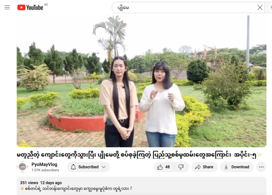 မေလအတွင်း၌ ပျိုမေ Vlog ဆိုသည့် ချန်နယ်လ်တခု စစ်ကောင်စီဝါဒဖြန့်ချိရေး ယန္တရားအတွင်း ပေါ်ထွက်လာခဲ့ပြီး YouTube နှင့် TikTok ပေါ်တွင်လည်း ပျိုမေ Channel နှင့် အကောင့်များကို ဖန်တီးခဲ့သည်။ စစ်မှုထမ်းနေသည့်သူများကို စစ်သင်တန်းကျောင်းများထိ သွားရောက်ရိုက်ကူးပြီး ဝါဒဖြန့်ချိခဲ့နေသည့် Vlog တွင် တင်ထားသည့် ဗွီဒီယိုများတွင် ပြည်သူများအကြား လူပြောများနေသည့် နေအိမ်နှင့် အဆက်အသွယ်ဖြတ်ခိုင်းမှုများ၊ ဖုန်းသိမ်းဆည်းထားမှုများမှာ မဟုတ်ကြောင်း သင်တန်းသားများနှင့် အင်တာဗျူး ပုံစံများပါဝင်သည်။ စစ်မှုထမ်းခြင်းကြောင့် ကိုယ်စိတ်ပိုမိုကျန်းမာကြံ့ခိုင်လာပြီး နိုင်ငံနှင့်ဘာသာသာသနာကို စောင့်ရှောက်ခြင်းဖြစ်သည်ဆိုသည့် ဇာတ်ကြောင်းကို လူငယ်များအကြား ပျံ့နှံ့စေရန်ရည်ရွယ်ပြီး ဦးနှောက်ဆေးခဲ့ကြသည်။ ထိုဗီဒီယိုဖိုင်များသည် အပိုင်းဆက်များဖြင့် ဆက်လက်ထွက်ပေါ်လျက် ရှိကာ ဩဇာကြီးမားသည့် စစ်လော်ဘီများမှလည်း ထပ်ဆင့်ပြန်လည်ဖြန့်ဝေလျက်ရှိနေသည်။ ပျိုမေ ဆိုသည့် စကားလုံးသည် မြန်မာလူငယ်များ အကြားရင်းနှီးပြီးသားအမည်တစ်ခုဖြစ်ပြီးယင်း နာမည်ကို အသုံးချကာ ဝါဒဖြန့်ချိရန်ကြိုးစားနေခြင်းဖြစ်သည်။ ထူးခြားမှုတစ်ခုမှာ မူလတွင် အမျိုးသမီးတဦးတည်း တင်ဆက်နေရာမှ အပိုင်း ၄ တွင် နောက်ထပ် အမျိုးသမီး တဦးထပ်မံပေါ်ထွက်လာခဲ့ခြင်းဖြစ်ပြီး ယင်း အမျိုးသမီး နှစ်ဦးနှင့်ပတ်သက်သည့် နောက်ကြောင်းများကို ဆက်လက်စုံစမ်းရန်ကြိုးစားသင့်ပါသည်။