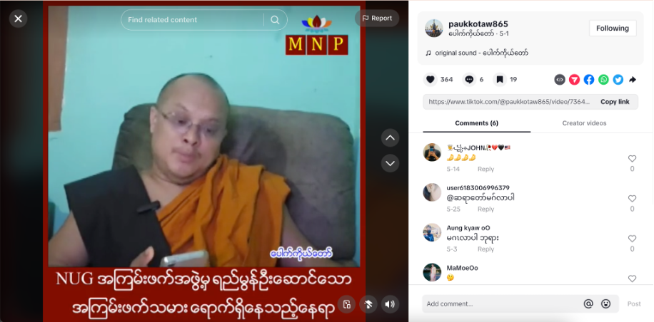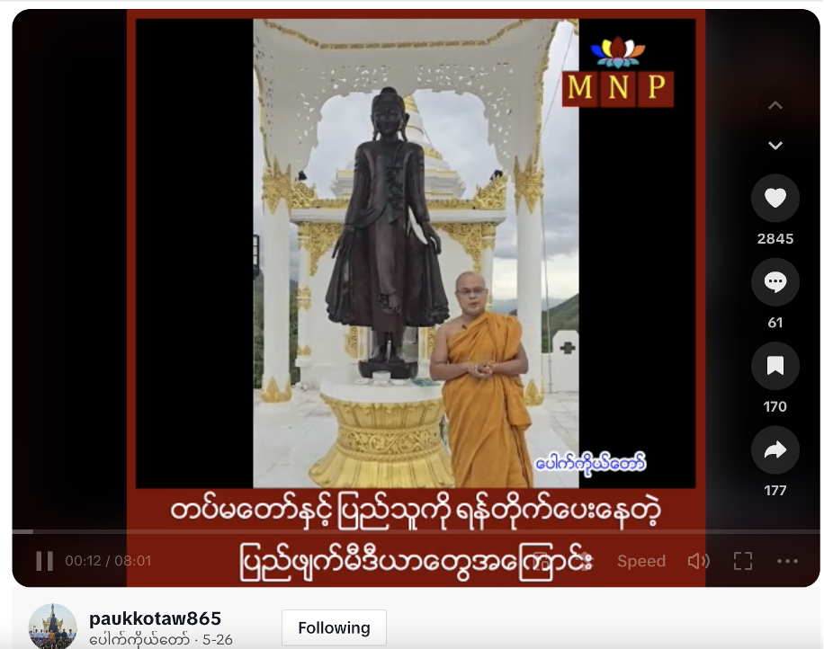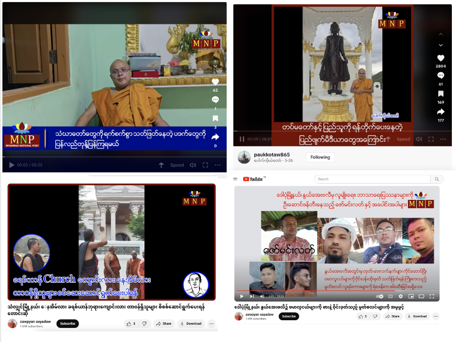 TikTok နှင့် YouTube ပေါ်တွင် ဘာသာရေးလူမျိုးရေးနှင့်ပတ်သက်ပြီး ပြဿနာဖြစ်ပေါ်စေရန်အတွက် သွေးထိုး လှုံ့ဆော်ဝါဒဖြန့်မှုများကို ကြိုးကိုင်နေသည့် အကောင့်များချန်နယ်လ်များကို အထူးသတိပြုရန်လိုအပ်သည်။ ၎င်းတို့သည် အချင်းချင်းပြန်လည်ဝေမျှသည့်နည်းလမ်းဖြင့် Youtube နှင့် TikTok ပေါ်တွင် ဖြန့်ဝေလေ့ရှိသည်။ အဓိက ကြိုးကိုင်ခြယ်လှယ်နေသည့် အကောင့်များမှာ ပေါက်ကိုယ်တော်၊ ဇော်ပျံဆရာတော်၊ နောင်တော်လေး၊ မပုတု၊ ကျော်စိုးဦး စသည့်အကောင့်များဖြစ်သည်။ အထူးသဖြင့် နောင်တော်လေးသည် Youtube နှင့် TikTok ပေါ်တွင် ဘာသာရေးနှင့် စစ်တပ်ဝါဒဖြန့်ချိရေးအတွက် အရေးကြီးသည့် ဇာတ်ကောင် ဖြစ်နေသည်ကို တွေ့ရသည်။ လူမျိုးရေး ဘာသာရေး စစ်ရေး နှင့်ပတ်သက်ပြီး ထိလွယ်ရှလွယ် ဗီဒီယိုဖိုင်များသည် နောင်တော်လေးဦးဆောင်လှုပ်ရှားနေသည့် MNP လိုဂိုဖရိန်ဖြင့်ထွက်ရှိလာခြင်း ဖြစ်သည်မှာ ထင်ရှားသည့် သက်သေတစ်ခုဖြစ်ပါသည်။ နောင်တော်လေးသည် ပေါက်ကိုယ်တော်၊ သုစိတ္တ၊ ဇော်ပျံဆရာတော် စသည့်အမျိုးသားရေးအစွန်းရောက် ဘုန်းကြီးများနှင့်ချိတ်ဆက်ကာ အင်တာဗျူးလိုရာဆွဲမေးပြီး ဖန်တီး ဖြန့်ဝေနေသည်။