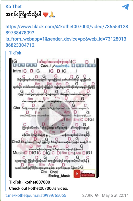 စစ်တပ်လော်ဘီများနှင့် အမျိုးသားရေး အစွန်းရောက်အကောင့်များသည် နိုင်ငံရေးအရဆက်နွယ်မှု မရှိဘဲ ပေါ့ပါးသည့်ပုံစံဖြင့် TikTok ပေါ်တွင် ဝါဒဖြန့်ရန် ကြိုးစားလာသည်ကိုတွေ့ရသည်။ ကိုသက်အကောင့်သည် ဂစ်တာလက်ကွက်ကော့ဒ်များပါဝင်သည့် ဗီဒီယိုများပါဖန်တီးကာ TikTok ပေါ်တွင် တင်ပြီး Follower တိုးပွားစေရန် လုပ်ဆောင်ခဲ့သည်။ သို့သော် ယင်းအကြောင်းအရာအား ရက်ပိုင်း အတွင်းပြန် ပြန်ဖျက်သွားခဲ့သည်။