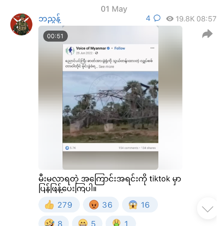 ထို့အပြင် ရန်ကုန်အပါအဝင် မြန်မာတစ်နိုင်ငံလုံးတွင် လျှပ်စစ်မီးများမကြာခဏပြတ်တောက်ရသည့် အကြောင်းအရင်းများမှာ PDF များက တာဝါတိုင်များကို မိုင်းခွဲတိုက်ခိုက်သည့်အတွက် လျှပ်စစ်မီးပျက်တောက်ရသည်ဆိုသည့် ဇာတ်လမ်းကို စစ်တပ်လော်ဘီများ တောက်လျှောက် ဖြန့်ချိလာခဲ့ပြီး TikTok ပေါ်တွင်ပြန်လည်ဖြန့်ဝေပေးကြရန် လှုံ့ဆော်မှုများပြုလုပ်ခဲ့သည်။