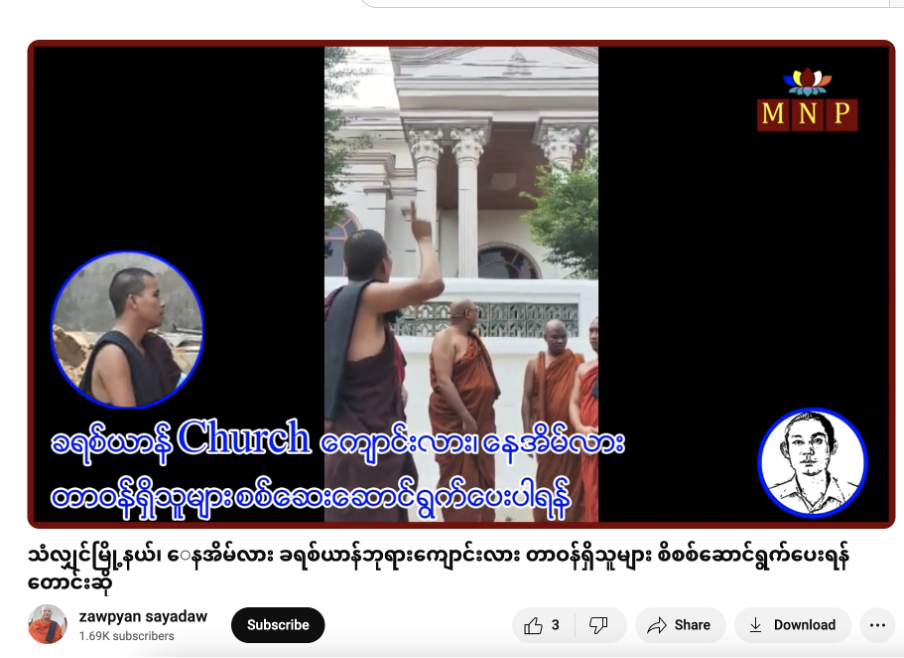 မွန်ပြည်နယ်အခြေစိုက် အမျိုးသားရေးဘုန်းကြီးဖြစ်သည့် ဇော်ပျံဆရာတော်က ၂၀၂၄ ခုနှစ် မေလ ၃ ရက်နေ့က YouTube ပေါ်တွင် ထပ်ဆင့် ဖြန့်ဝေခဲ့သည့် ရုပ်သံဖိုင်တစ်ခုသည် ခရစ်ယာန်ဘာသာဝင်များနှင့် ဗုဒ္ဓဘာသာဝင်များအကြား အမုန်းမီးပွားစေနိုင်သည့် ရုပ်သံဖိုင်ဖြစ်သည်။ ယင်းရုပ်သံတွင် ပါဝင်သော အကြောင်းအရာများမှာ သန်လျင်မြို့ရှိ ဆောက်လုပ်စ နေအိမ်တစ်ခုကို ခွင့်ပြုချက်မရှိဘဲ ခရစ်ယာန်ဘုရားကျောင်း အဖြစ်ဆောက်လုပ်နေသည်ဟု စွပ်စွဲပြောဆိုကာ မျိုးချစ်မြန်မာရဟန်းတော်များသမဂ္ဂ အမျိုးသားရေးအစွန်းရောက် ဘုန်းကြီး ဦးပညာဝံသ ဦးဆောင်သည့် ဘုန်းကြီးများက သွားရောက်စစ်ဆေးပြီး သက်ဆိုင်ရာအနေဖြင့် အမြန်ဆုံး စိစစ်ပြီး ထုတ်ပြန်ပေးရန် တောင်းဆိုခဲ့ခြင်းဖြစ်သည်။ လေ့လာဆန်းစစ်မှုအရ ယင်းနေအိမ်သည် ခရစ်ယာန်ဘာသာဝင် တစ်ဦးက ကုမ္ပဏီရုံးခန်းအဖြစ်အသုံးပြုရန်ရည်ရွယ်ကာ ဆောက်လုပ်ဖွယ်ရှိပြီး လက်ဝါးကပ်တိုင်ပုံစံကိုနေအိမ် တွင်ထည့်သွင်းဆောက်လုပ်ခဲ့မှုကို ခရစ်ယာန်ဘုရားကျောင်း ဆောက်လုပ်သည်ဟု စွပ်စွဲခံရခြင်းဖြစ်သည်။ ခရစ်ယာန်ဘုရားကျောင်းဖြစ်သည်ဟုဆိုသော ခိုင်မာသည့် သက်သေအထောက်အထားများ မရှိသော်လည်း မျိုးချစ်ရဟန်းတော်များသမဂ္ဂ သွားရောက်စွပ်စွဲ ပြဿနာရှာခဲ့ခြင်းဖြစ်သည်ဟုသုံးသပ်ရသည်။ ယင်းဖြစ်ရပ် နောက်ဆက်တွဲကို ဆက်လက်စောင့်ကြည့်ရန် လိုအပ်သည်။
