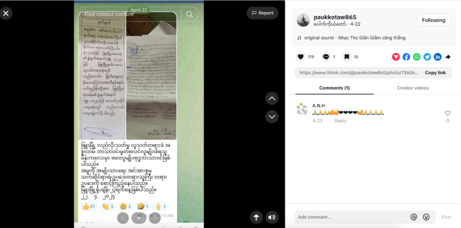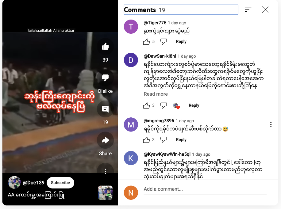Facebook ပေါ်တွင် နေရာမရသောအခါ TikTok နှင့် YouTube ပေါ် ရောက်လာသည်။ စစ်တပ်လော်ဘီများနှင့် အမျိူးသားရေးအစွန်းရောက် အကောင့်များသည် TikTok နှင့် YouTube ပလက်ဖောင်းများကိုအသုံးချပြီး မတ်လ၊ ဧပြီလနှင့် မေလအတွင်း ဝါဒဖြန့်ချိမှုများ လှုံ့ဆော်မှုများပြုလုပ်ခဲ့ရာတွင် သင်္ကြန်ကာလအတွင်း ဖြစ်ပေါ်ခဲ့သည့် AA နှင့် ရိုဟင်ဂျာများအကြား ပဋိပက္ခများကို စစ်တပ်လော်ဘီများနှင့် အမျိုးသားရေး အစွန်းရောက်များက ကောင်းကောင်းအသုံးချကာ အမြတ်ထုတ်မှုများပြုလုပ်ခဲ့သည်ကိုတွေ့ရသည်။ အထူးသဖြင့် ထိလွယ် ရှလွယ် လူမျိုးရေးကိစ္စတွင် AA သည် ရခိုင်ပြည်နယ်မှ မွတ်ဆလင်များကိုလူမျိုးတုန်း သတ်ဖြတ်မှုများပြုလုပ်နေသည် ဟုဆိုကာ ဆက်တိုက် ဆိုသလို ဖြန့်ဝေမှုများကို ပြုလုပ်လာခဲ့ကြပါသည်။